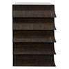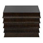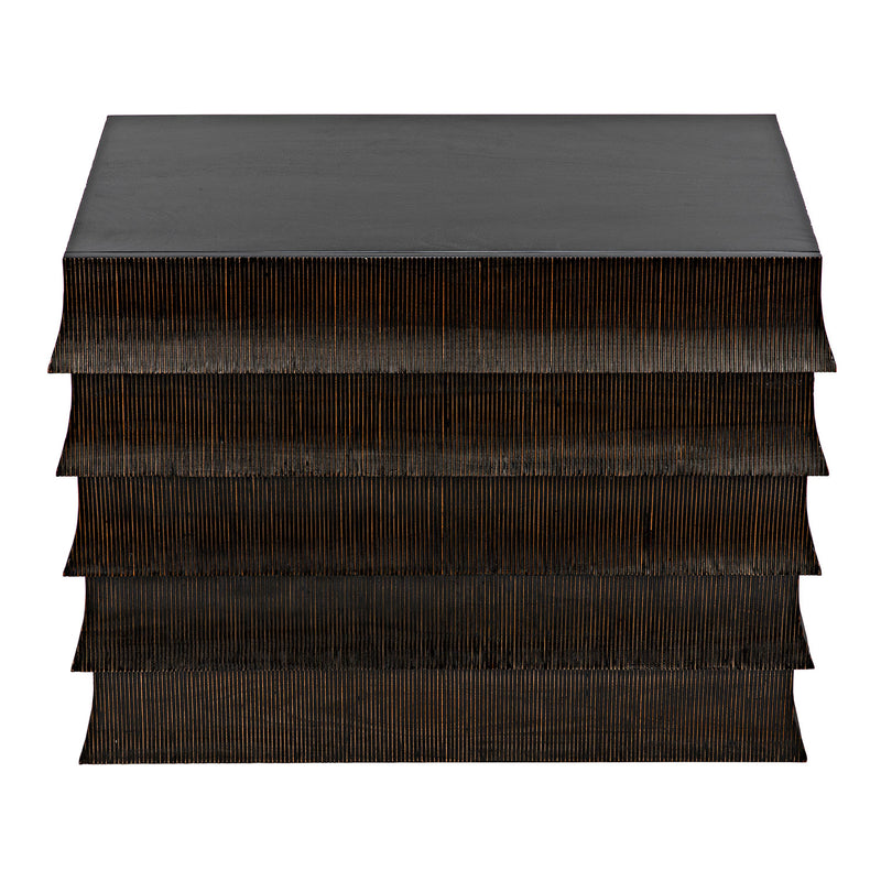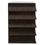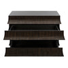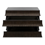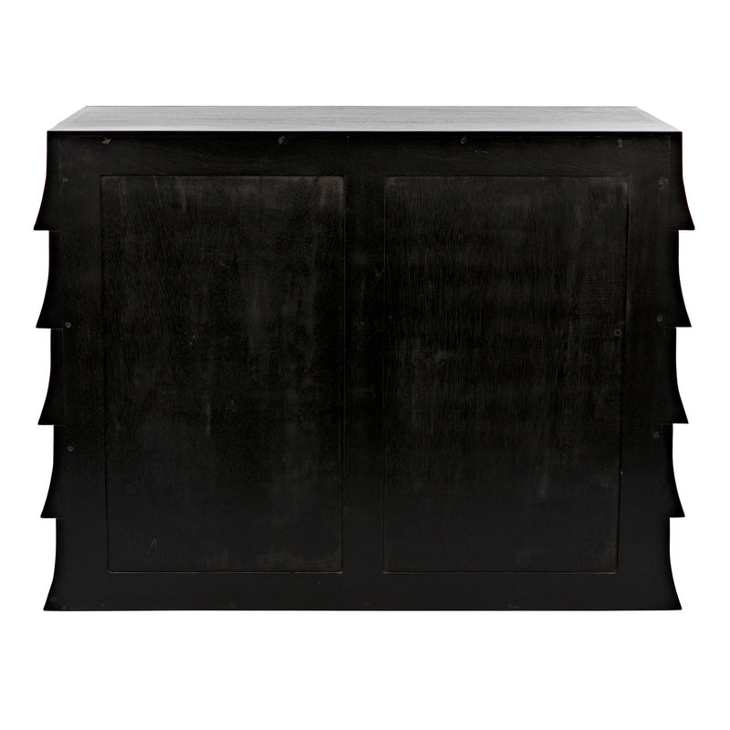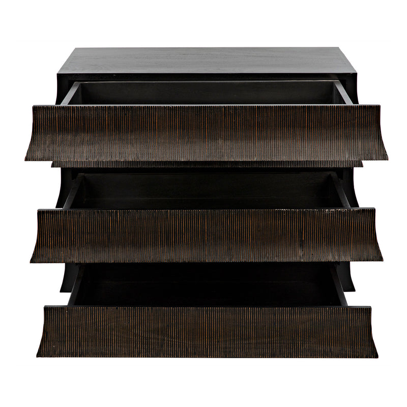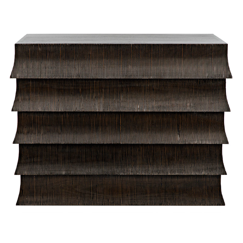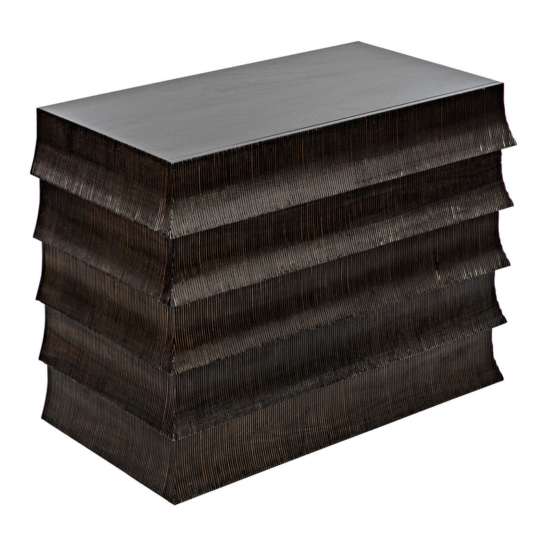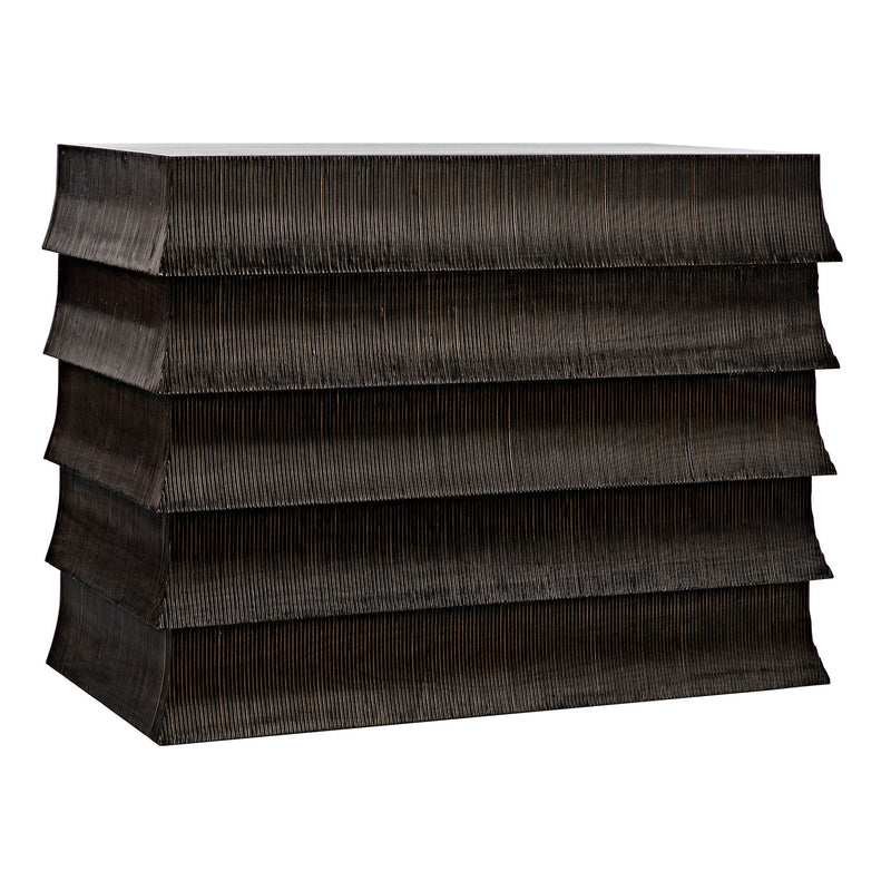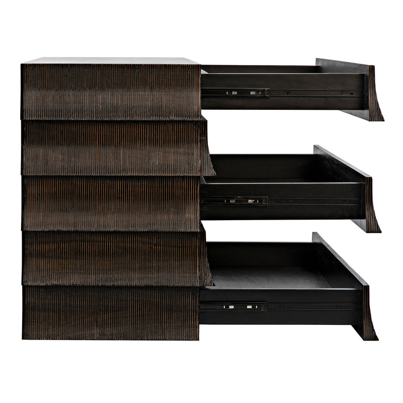 Store your everyday items in style with this contemporary dresser from Noir. Functional yet full of elegant detail, this furnishing updates any room with a bold statement. Ruffled carvings inspired by the dresses worn by flappers in the 1930's elevate the 5-drawer Noir Ava dresser far above the ordinary. Hand carved of mahogany; it is finished in a hand rubbed black with light brown highlights.