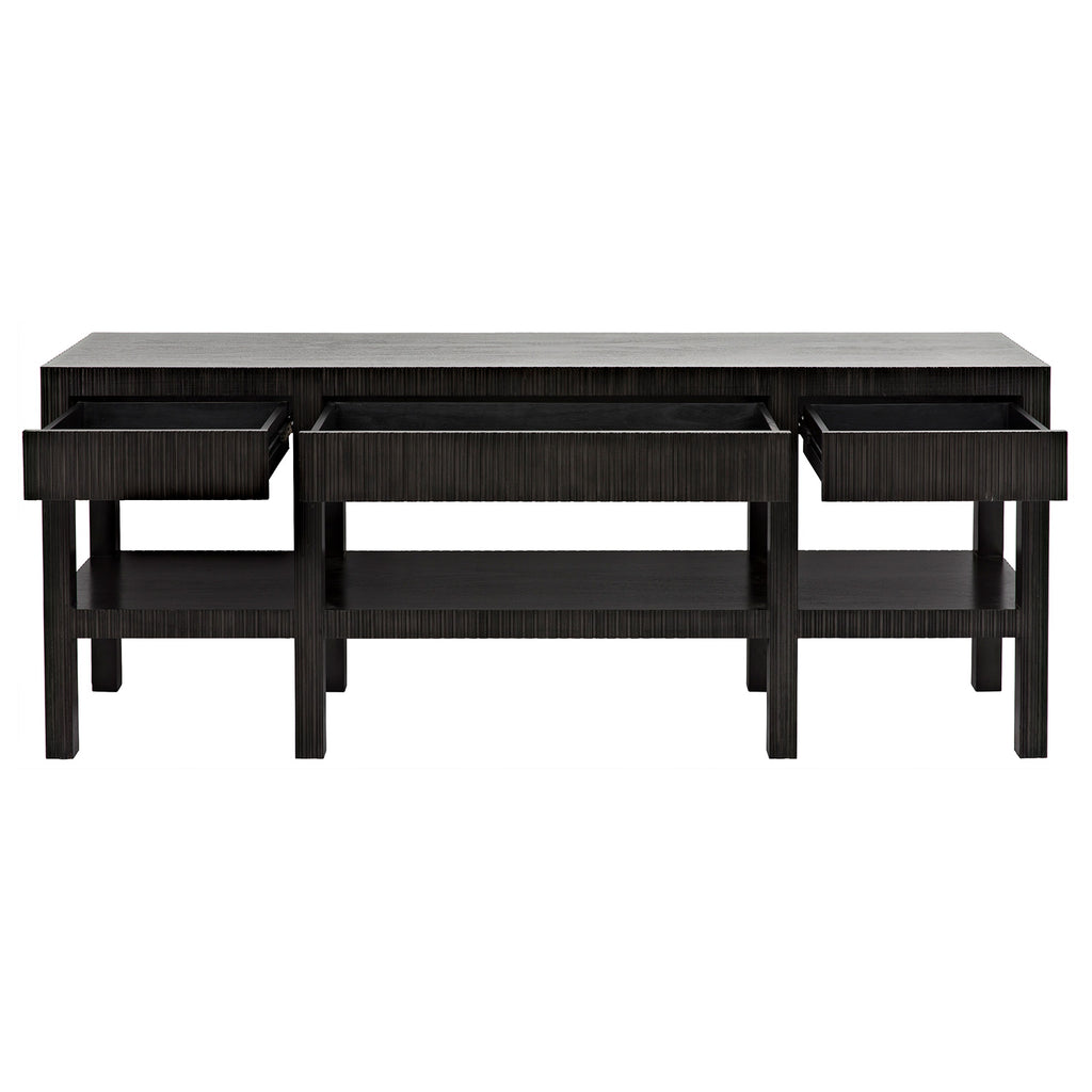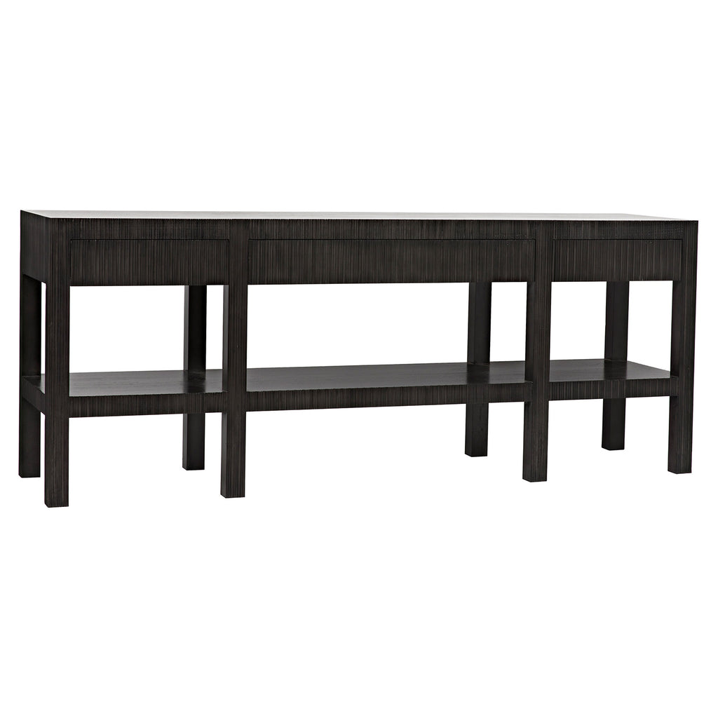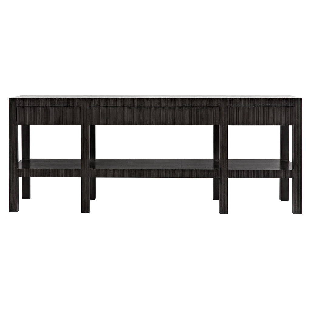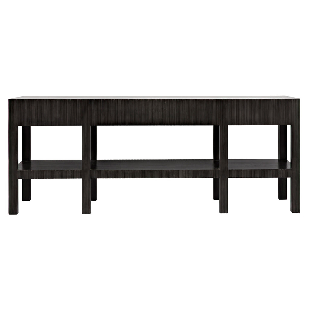 An excellent addition to a foyer or hallway, this Noir console table delights with contemporary flair. Simple yet chic, this functional furnishing adds dimensional depth to any space. Elegance interpreted, the solid mahogany Noir Conrad console is distinguished by its clean lines, expert hand-craftsmanship, and the pale finish that enhances the natural grain of its hardwood.