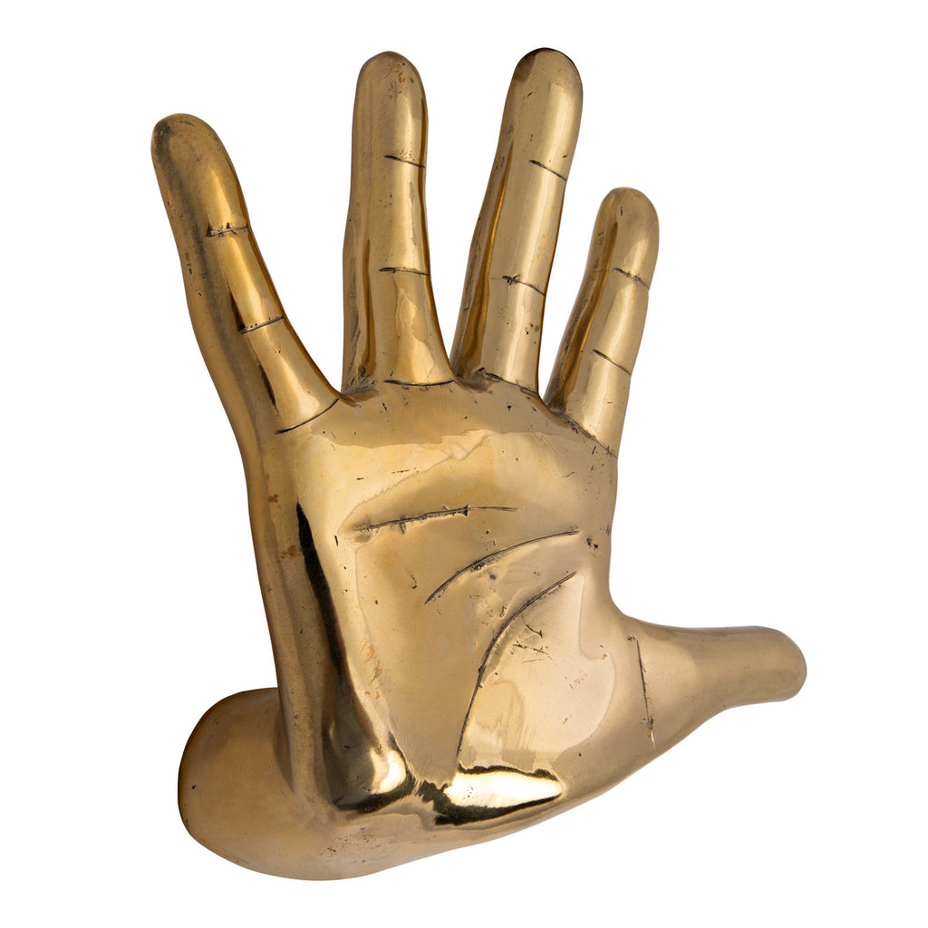 This Noir wall decor brings visual interest into a room with contemporary sophistication. Perfect above a couch or as an accent on a side wall, this chic decor adds dimensional depth to any aesthetic. An open hand is rendered simply in an expertly weathered warm antique finish. Featuring raw, stylized lines, this intriguing brass wall accent is the perfect piece to add interest to any modern décor. Handcrafted of brass, no two will be identical.