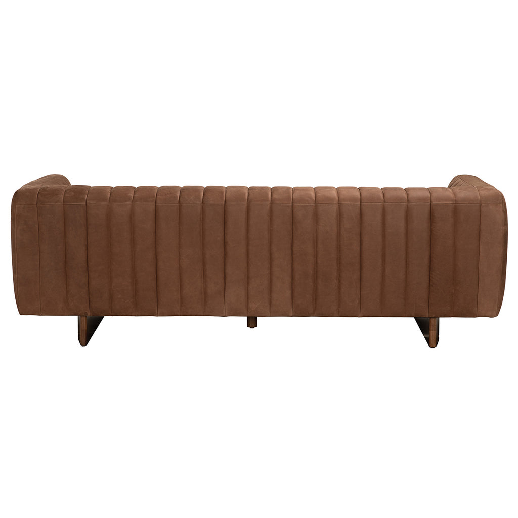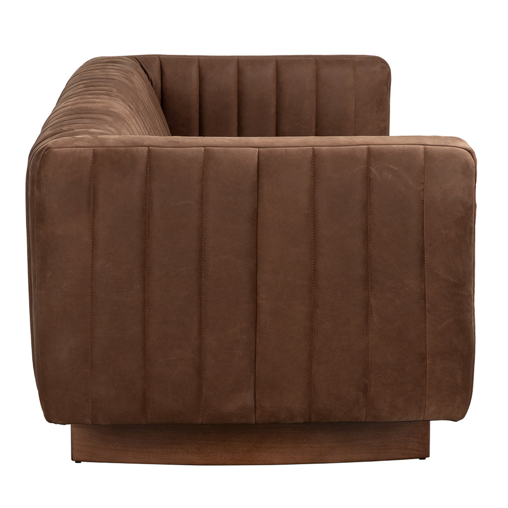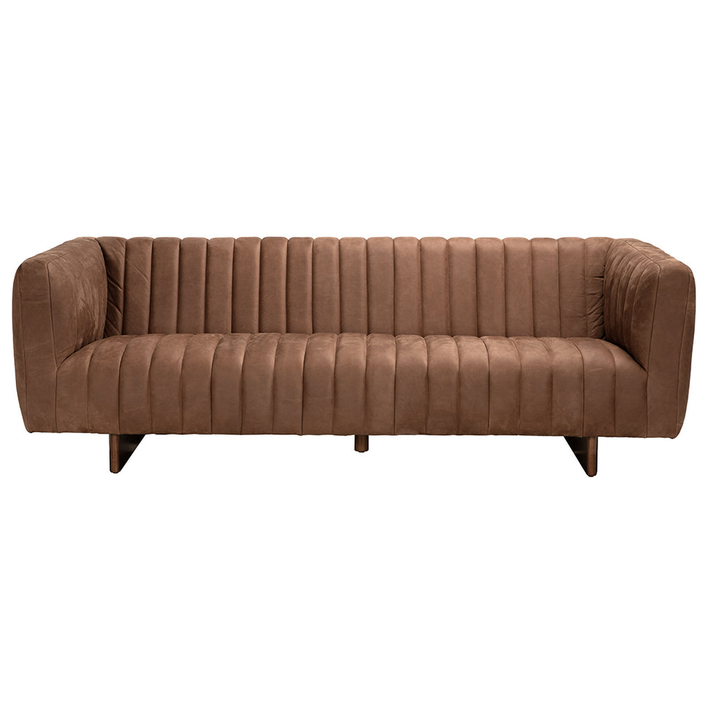 Rooted in craftsmanship and rich in character, the Khann Sofa is upholstered in supple Orris Brown leather. Its clean, linear silhouette is grounded by a warm wood base and elevated by a 6" clearance.