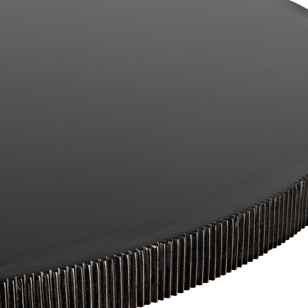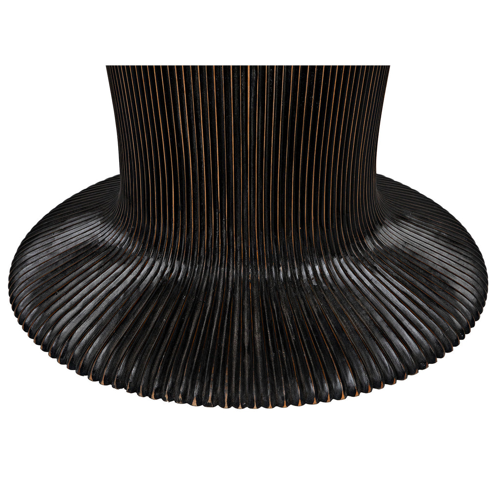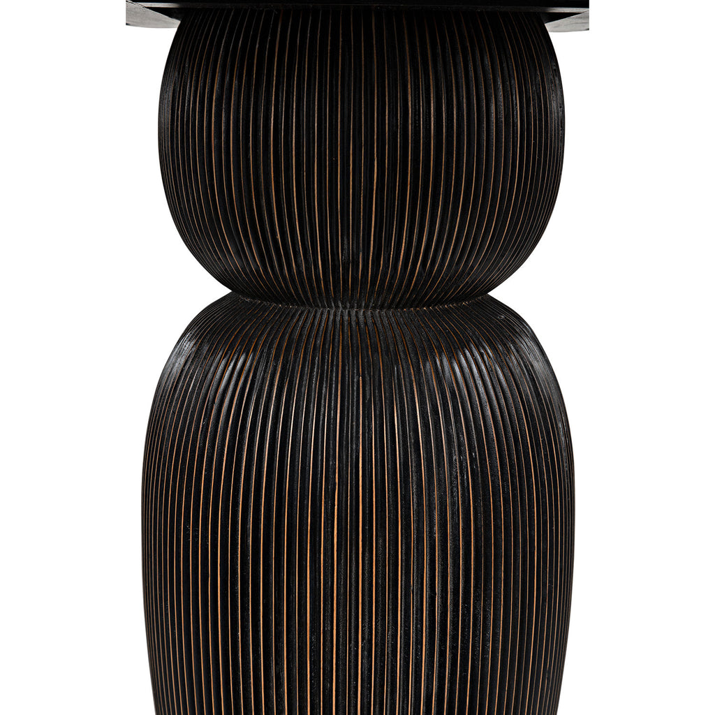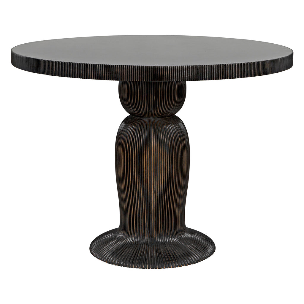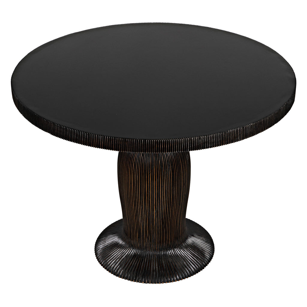 Enjoy hosting dinners and cocktails in your home with this gorgeous dining room at the center. Expressing touches of modernity, this Noir furnishing still offers a versatile look that can accommodate any style. A finely detailed ribbing effect over the body and top edge of this 40" Noir Portobello dining table suggest a mushroom or cinched tassel. The hand rubbed black finish with a rubbed edge reveals the "golden" wood tone underneath creating a shimmering effect.