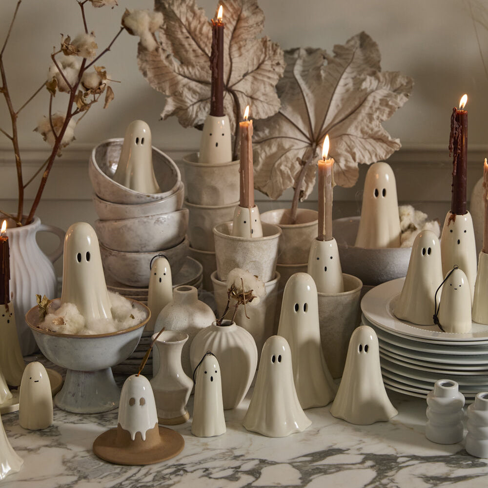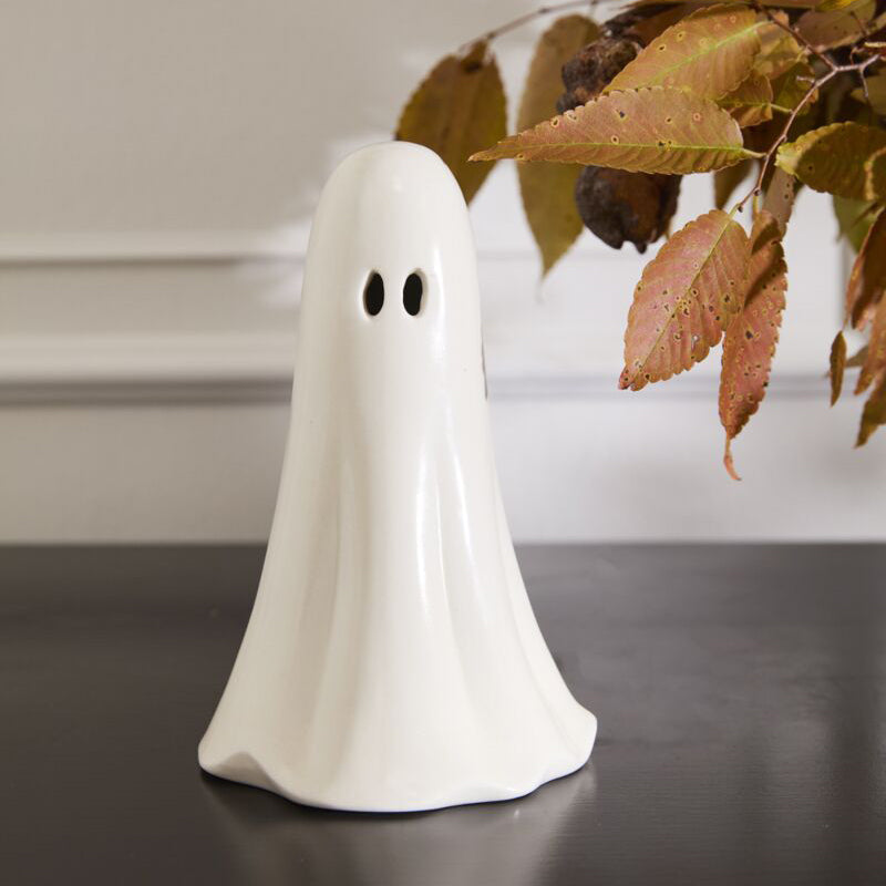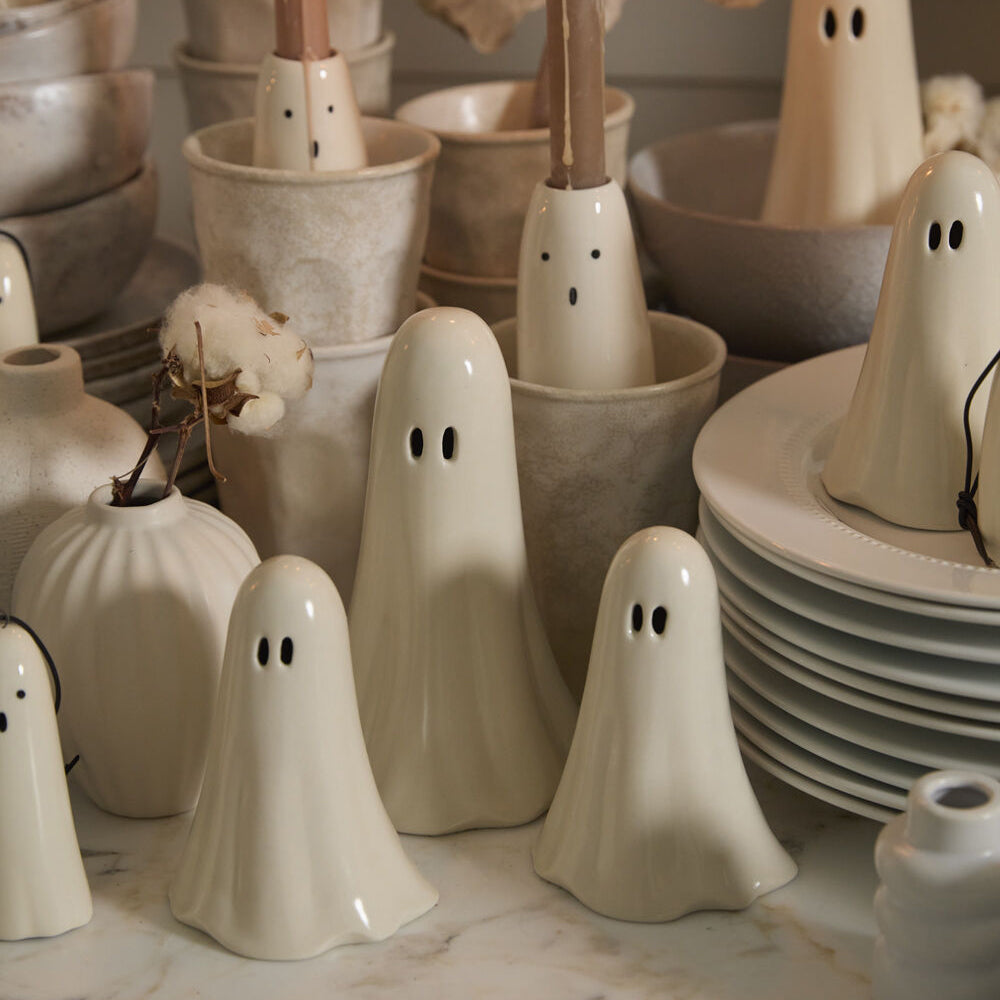 Just a little scary & spookily versatile, the Not So Ghostly Figurines Collection includes two sizes of classic, ceramic ghosts that can layer into any bookcase, tablescape, or Halloween moment. These not-so-spooky ghosts are hand painted, have open oval-shaped eyes & an open base that allows them to be paired with a tealight for a soft glow. Layer multiple ghosts together for a playful & impactful Halloween display.