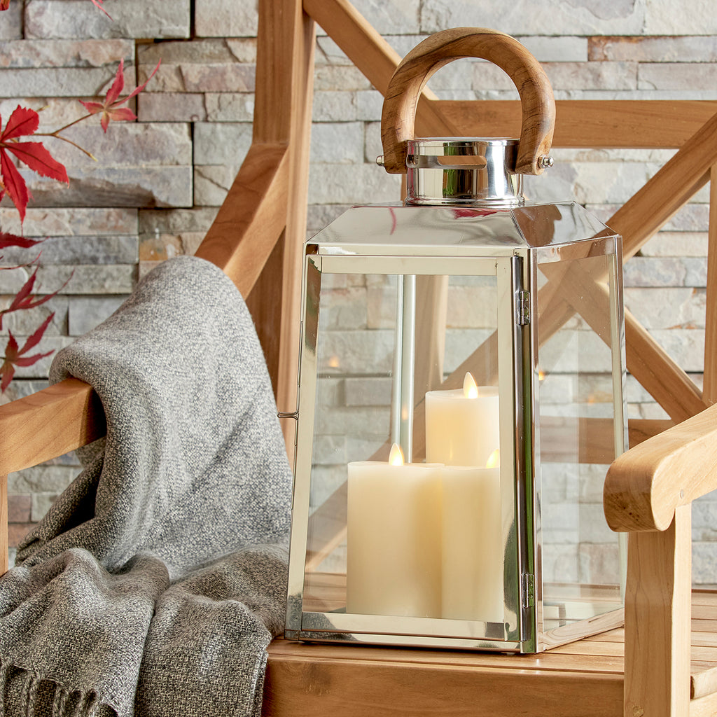 Nautical in style, this handsome outdoor lantern shines brilliantly in a chrome finish and real teak wood handle. Add a couple of pillar candles and it makes a beautiful accent for the front stoop.