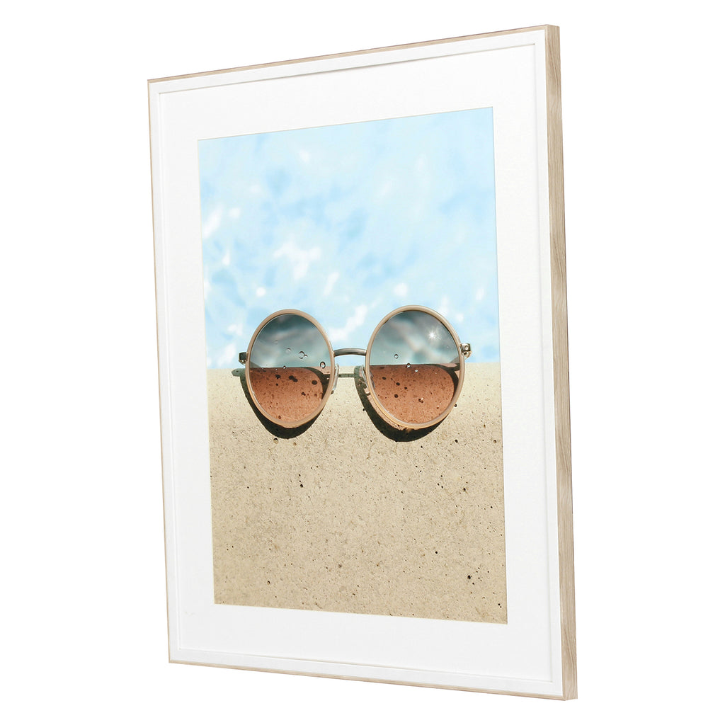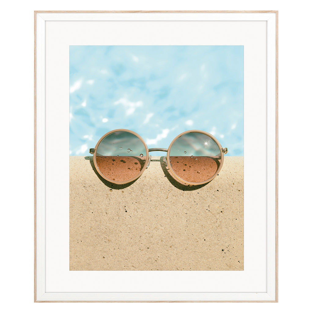 Summertime vibes invite you to chill and relax. Matted in white and framed in a ribbed white wood with blonde wood finish side.