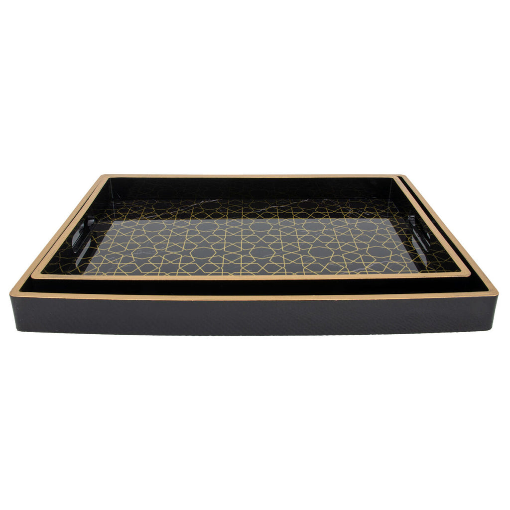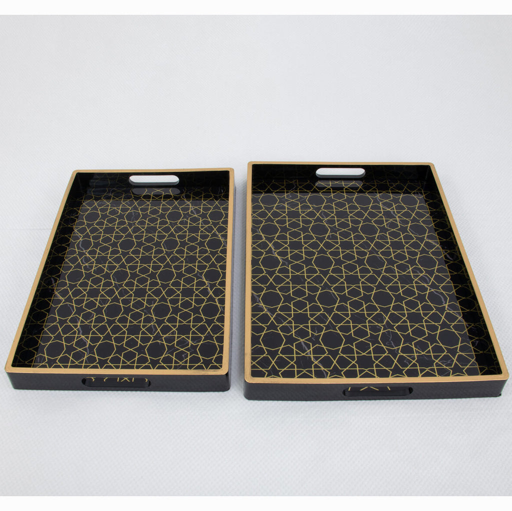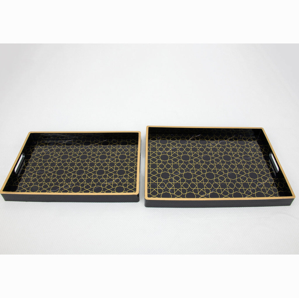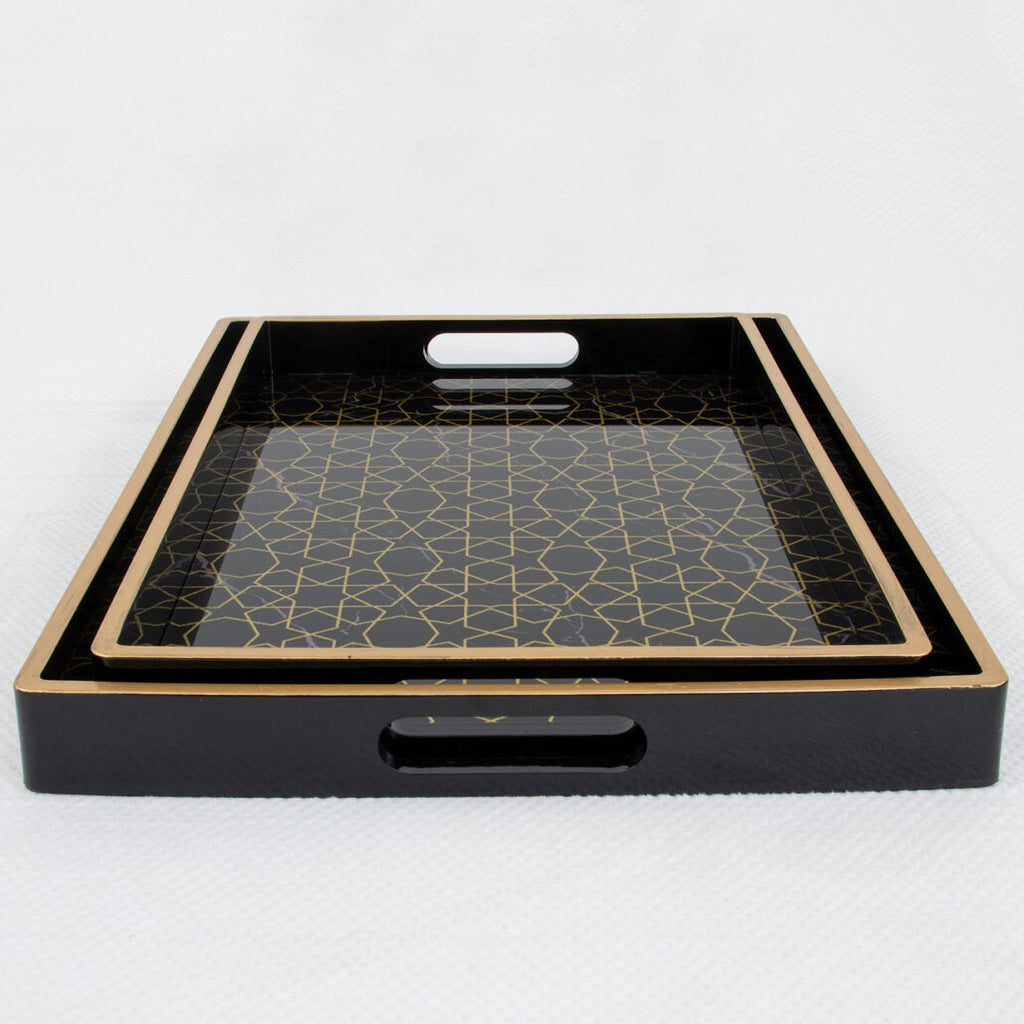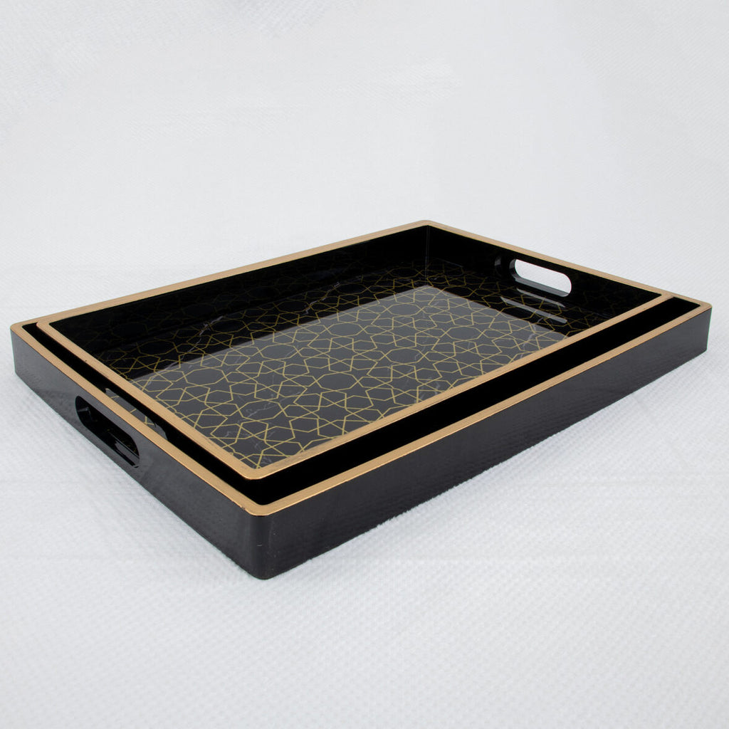 Stylish Set of 2 Trays with Black Frame and Gold-Lined Patterned Bottom. Add a touch of modern sophistication to your space with this sleek set of two trays. Designed with a bold black frame accented by a gold-lined patterned bottom, these trays exude elegance and refinement. The intricate gold line design on the bottom creates a contemporary yet timeless aesthetic, perfect for serving drinks, snacks, or showcasing decorative pieces. Whether used for entertaining or as a chic decor element, these trays bring style and versatility to any setting.