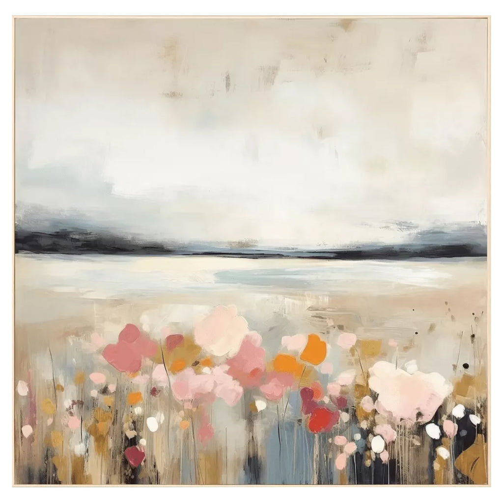 A field of poppies features a hand applied enhanced gel finish. Dimensionally framed in a distressed ivory wood. No glass.
