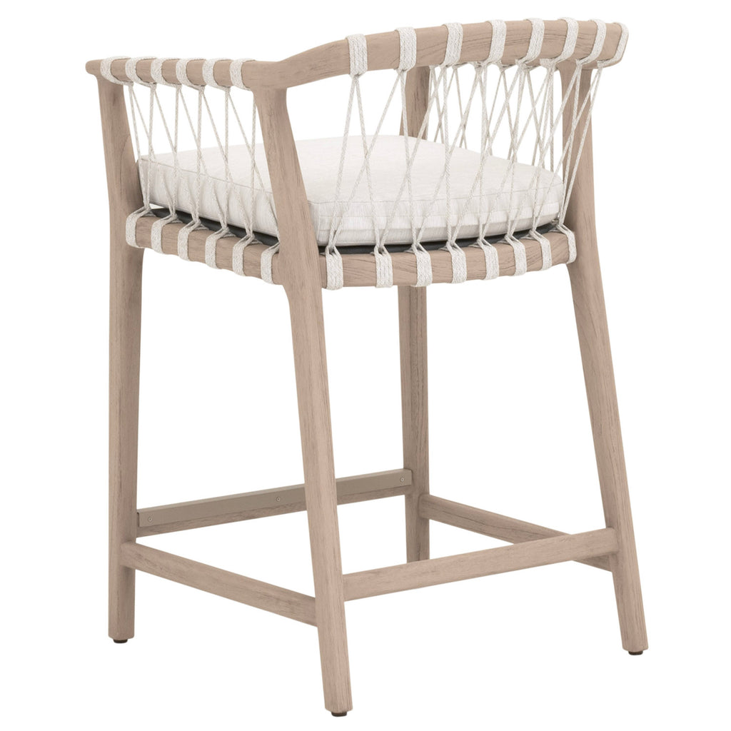 The Pacific Outdoor Counter Stool by Essentials For Living merges coastal design with durable materials for outdoor use. Its solid teak wood frame has an Ever Teak finish that neutralizes the natural tones of the teak and is resistant to change from the elements. The white speckle hand-woven polyolefin rope adds structure and a nautical flare to the seat. The removable and reversible seat cushion is upholstered in performance white speckle olefin fabric with plush foam that should be stored away in heavy rain or extreme weather. At 24" wide, 22.5" deep, and 35" high with a 27.5"seat height, it features an L-shaped metal footrest cover for added support, making it a durable, inviting perch for al fresco gatherings under open skies.