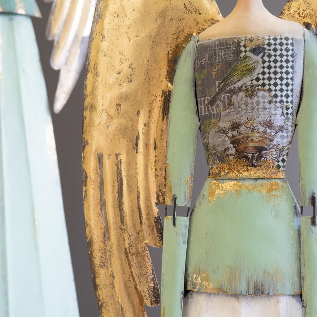 Hark! These crowned heavenly hosts in green and white, one with folded hands, the other holding a golden heart, make perfect holiday decor or a special gift. This pair of painted metal angels will watch over your entryway or keep Santa company.