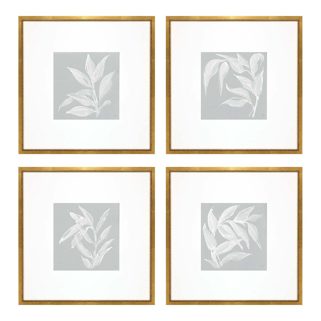 Blue and white leaf silhouettes are matted in white. Framed in a traditional antique gold wood with beaded lip. Sold as set of four.