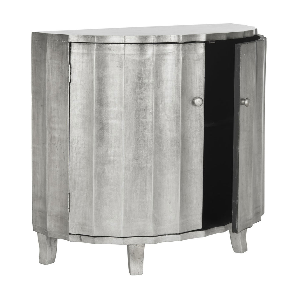 Elegant and sophisticated, this demilune cabinet is exquisitely detailed with fluted double doors and decorator pulls. Finished in silver leaf, it will dress up a bedroom, hall or living room while providing ample storage space.