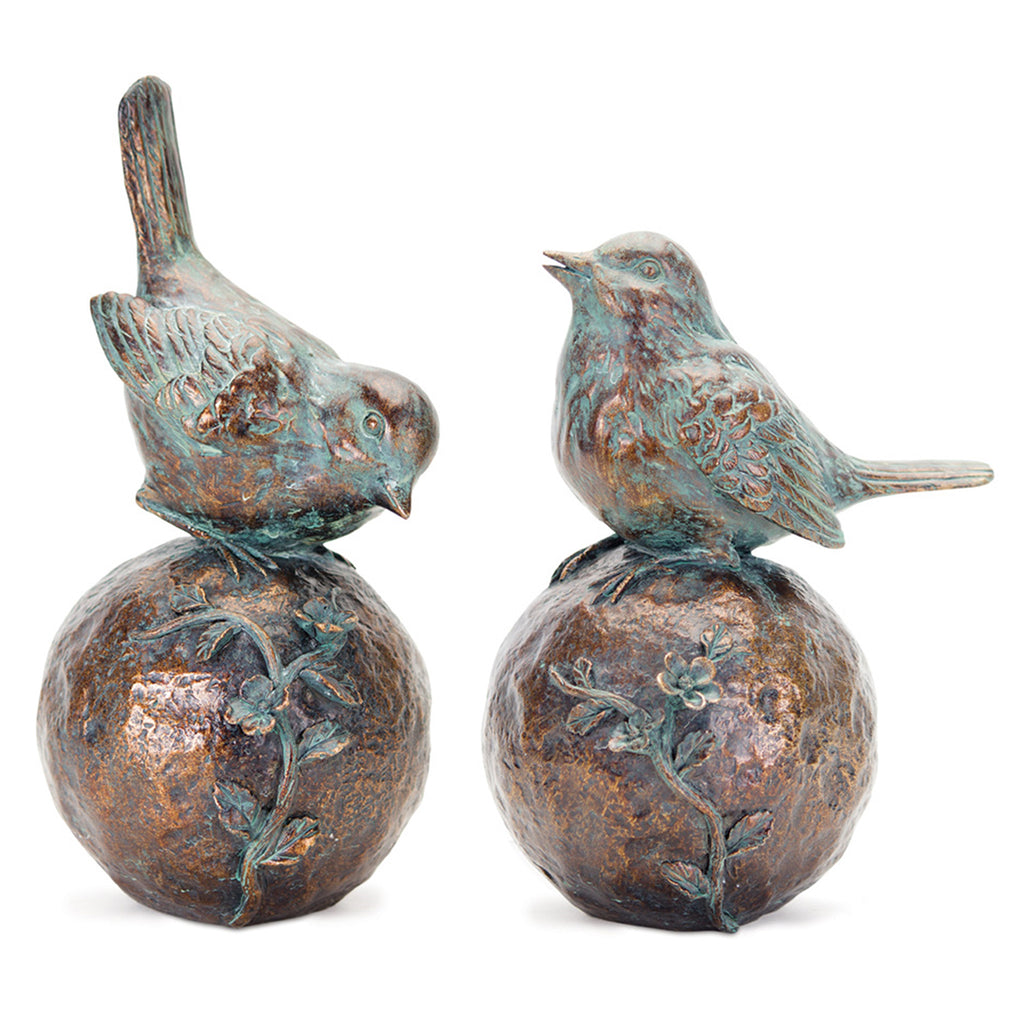Add an elegant touch of nature to your home with this beautiful set of Bird Orb Figurines. Featuring two assorted designs, this set is the perfect addition to your spring home decor. The rustic bronze and blue finish paired with the quality polyresin composition is the perfect combination to create a beautiful spring display. Arrange together to make a statement, or display separately to accent other decor pieces.