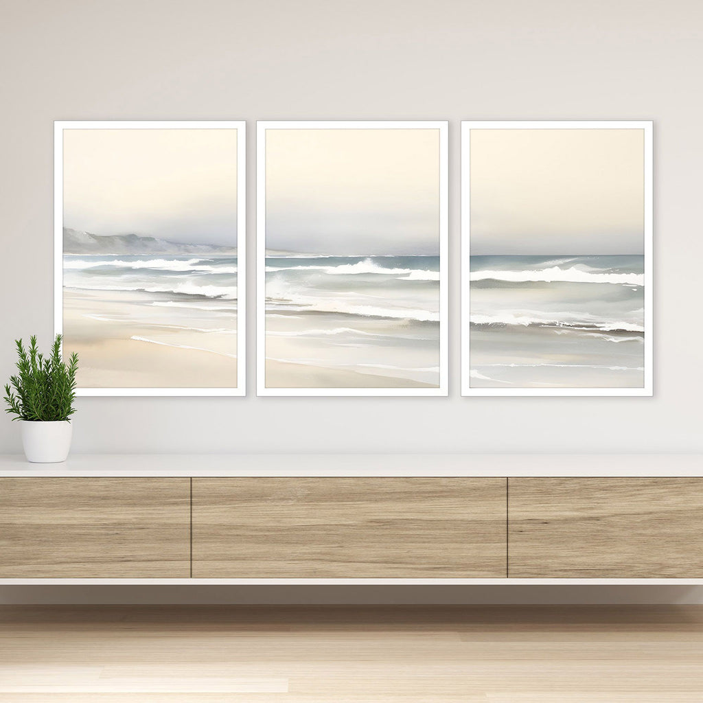 Soothing ocean tides lend a calming presence. Framed in a lacquered white wood shadow box style moulding.