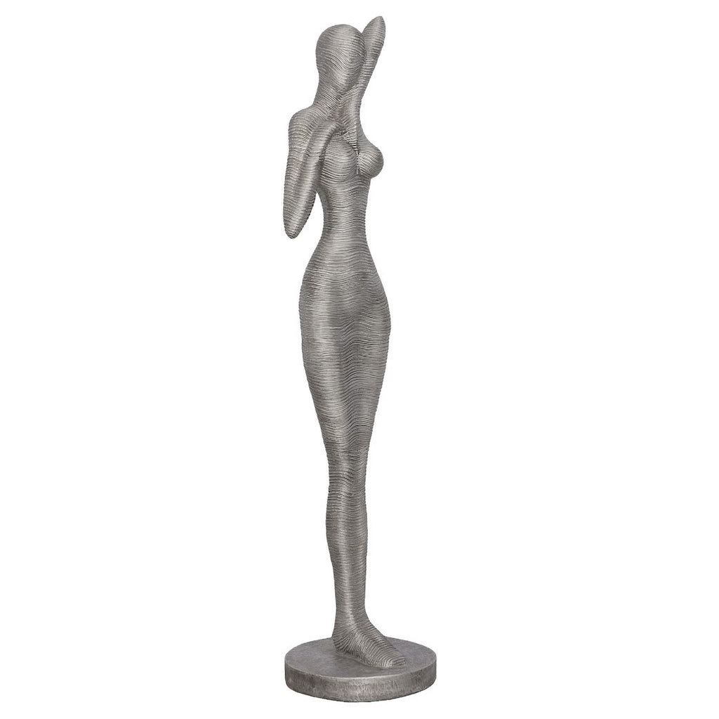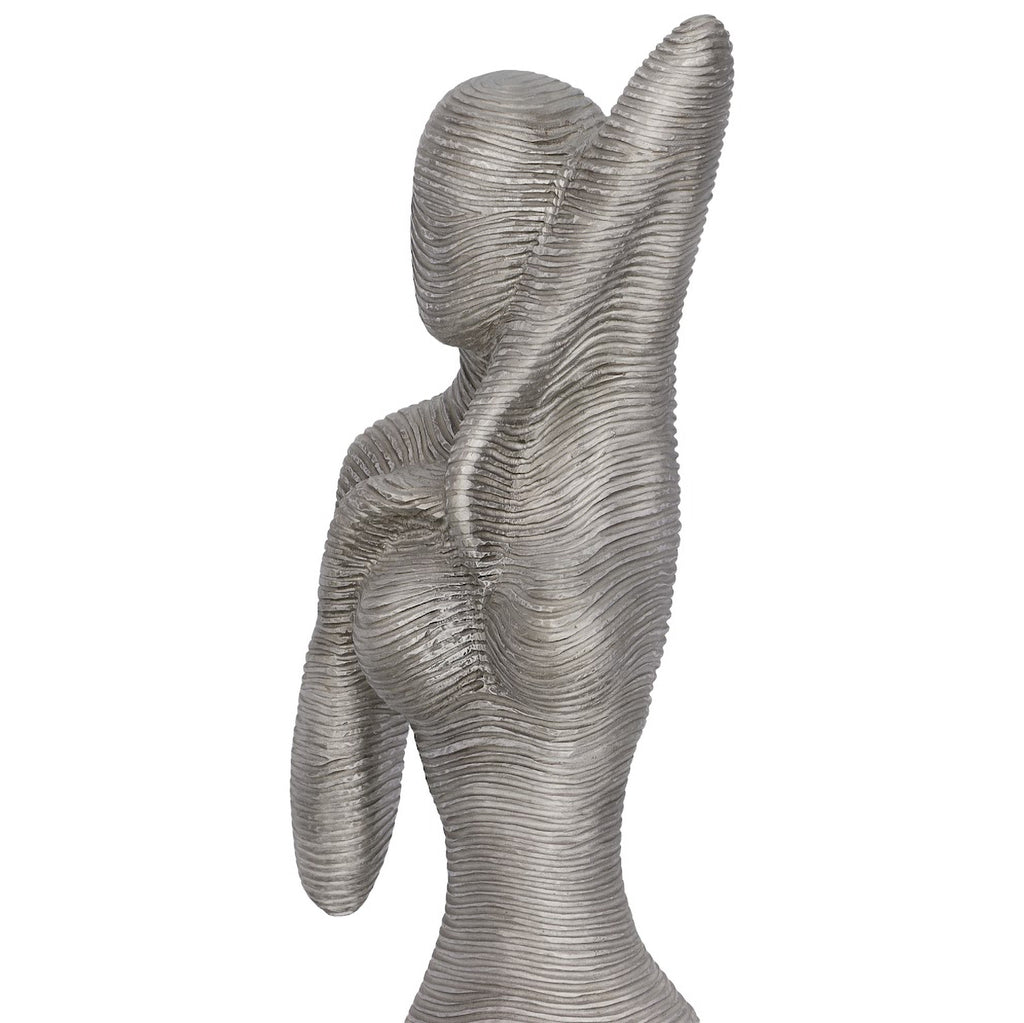 The Admiring Standing Sculpture is made of aluminum in a striated surface that brings it one aspect of its design distinction: when the finish is rubbed onto its surface, it collects in the valleys to bring added patina to the gray sculpture. This lends it a textural feel that convinces the eye this is a vintage decorative accessory. In the foyer of a modern home filled with contemporary art, this decorative accessory will hold its own.