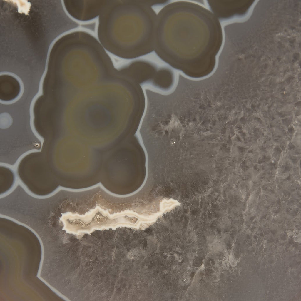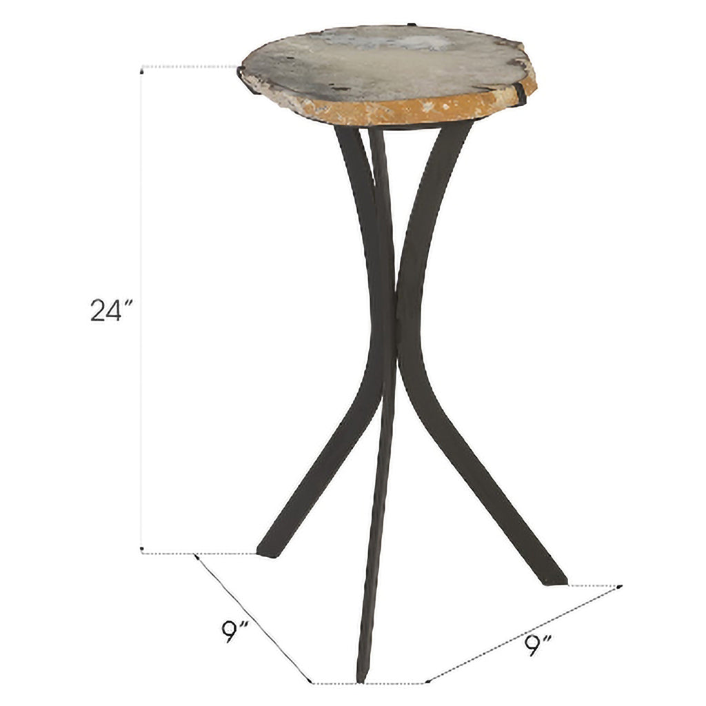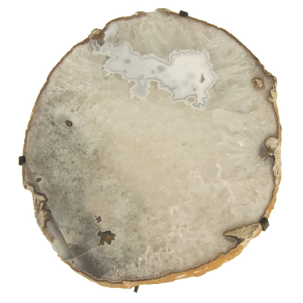 The Agate Side Table comes in many variations. The profile doesn't change but the personality of the tabletop does, as the assorted stone discs carry the unique veining inherent in each slice. Agate is characterized by its fine grain and bright color. It is most commonly found in volcanic rocks or ancient lavas where silica has melted and deposited in layers on the walls.