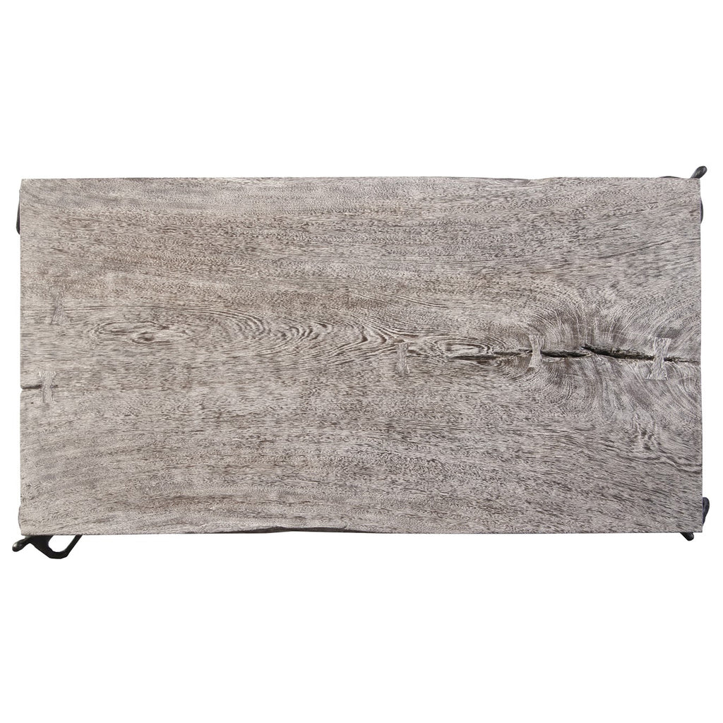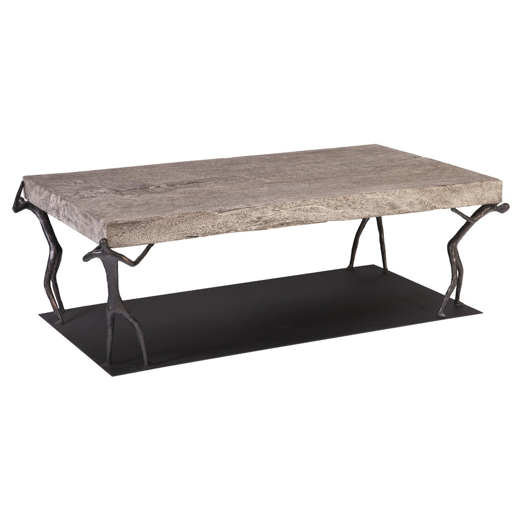 The Atlas Coffee Table has a storied namesake. In Greek mythology, Atlas was the Titan god of endurance whom Zeus tasked with holding up the celestial heavens for eternity. The figures supporting the wood top of this gray coffee table have as weighty a job as the mythical hero. Exquisite craftsmanship has rescued the reclaimed chamcha wood top from being one of Nature’s finest castaways by making it into an elemental design statement. Combined with the whimsical black metal base, the overall style is fitting for a number of interiors, including contemporary, modern farmhouse, and industrial chic.