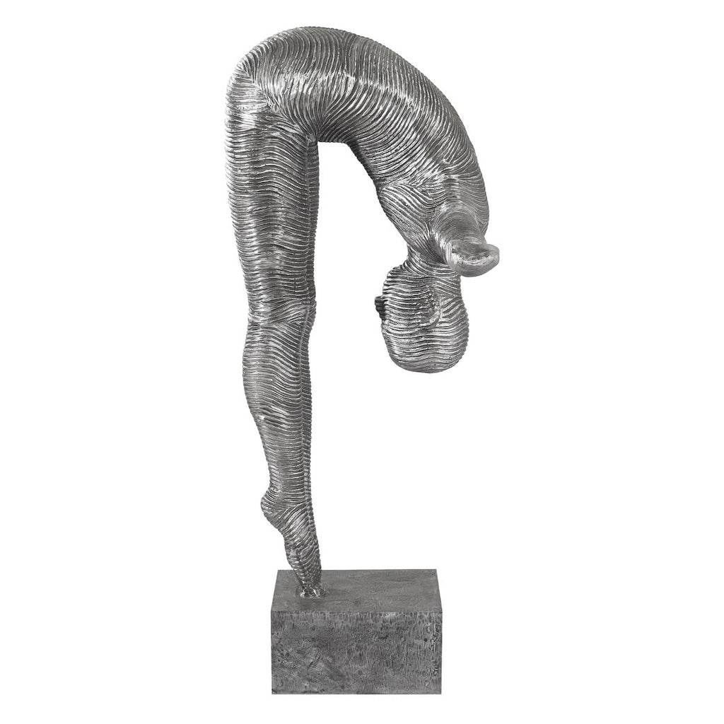 The Large Bending Diver Sculpture that is made of metal in an aluminum finish. It has a striated surface that enhances its design distinction—when the finish is rubbed onto its surface, it collects in the valleys to bring added patina to the gray sculpture. This lends it a textural feel that convinces the eye this is a vintage decorative accessory. In the foyer of a modern home filled with contemporary art, this silver sculpture will hold its own. We also offer our lovely diver as wall sculptures in several sizes and in other sizes as table sculptures.
