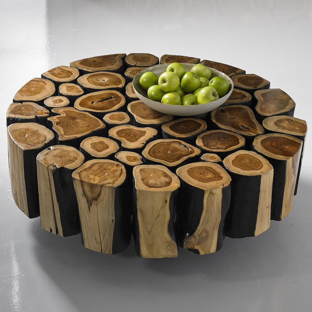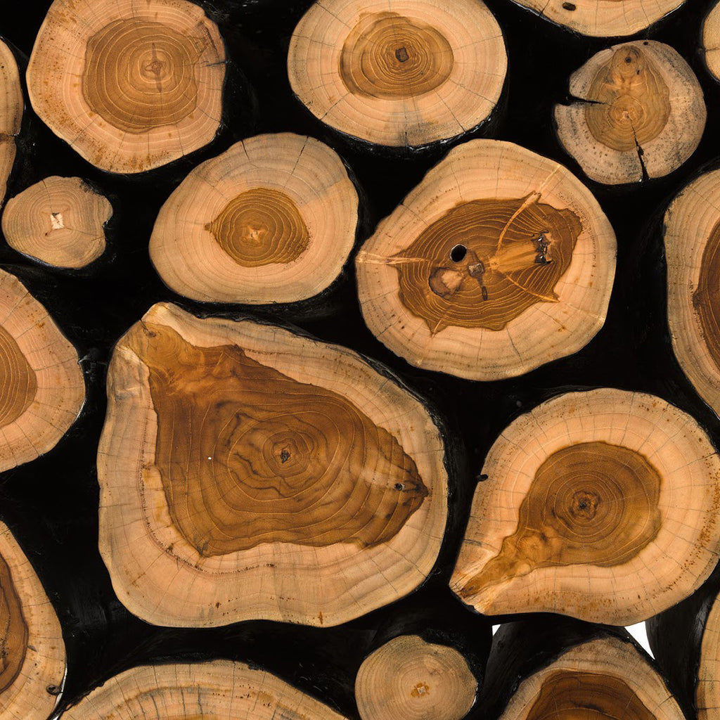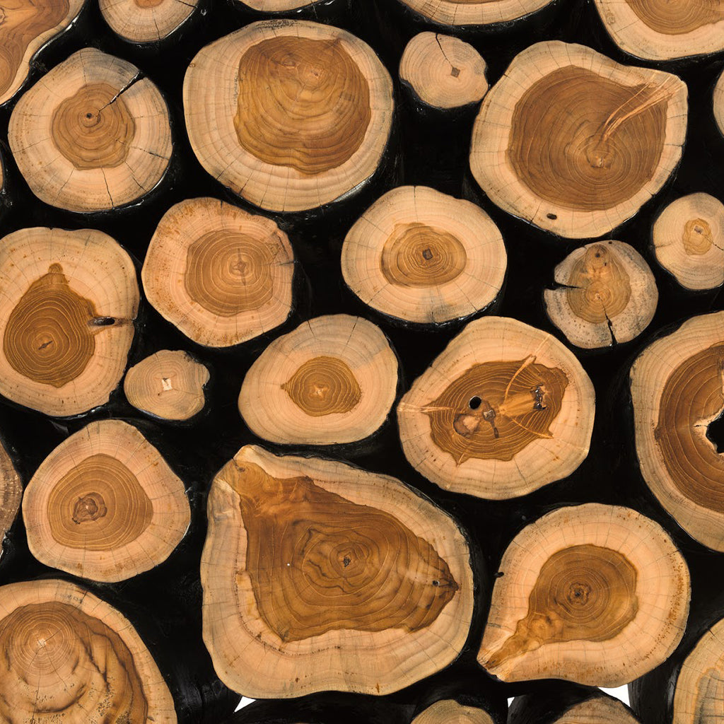 Several design distinctions of note on the Boscage Round Coffee Table are the natural graining on the surfaces, the textural beauty of the rings on the tops of the wood slices that illustrate the life of the tree, and the burnt edges on some of the pieces joined together to create this masterpiece.
