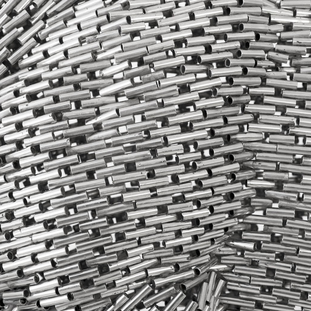 A true testament to artistry, the Bull Pipe Sculpture illustrates how a talented artisan can take a brute material and bring it a sense of movement. With muscles rippling and tail flashing, the silver sculpture, which is made of stainless steel, achieves the sense of motion that convinces the senses that its nostrils are flaring. The mesh material that flows along the surface of this decorative accessory is textural in nature, which makes this metal sculpture perfect for a room that can benefit from a bit of an edge.