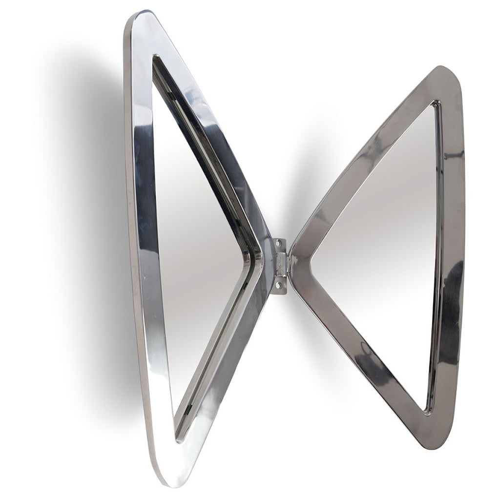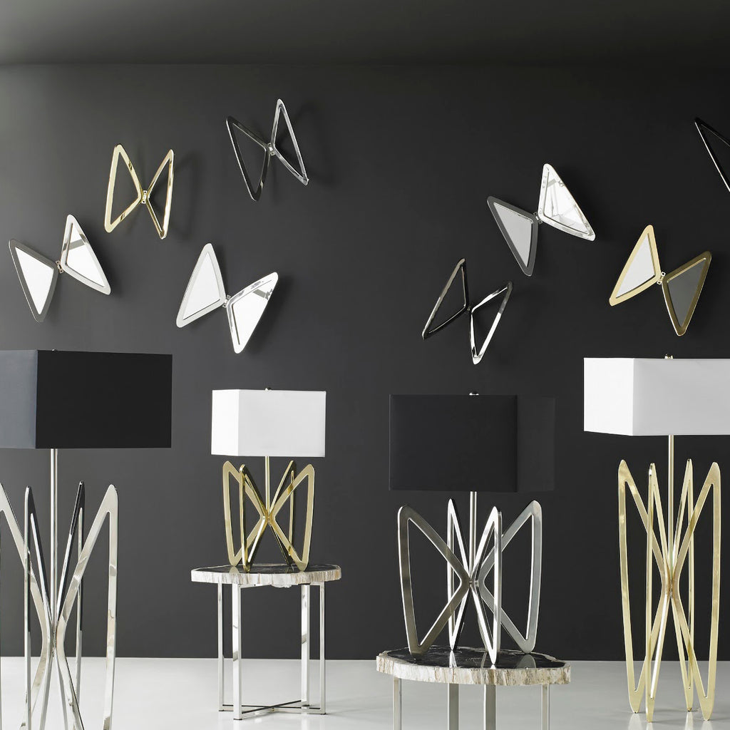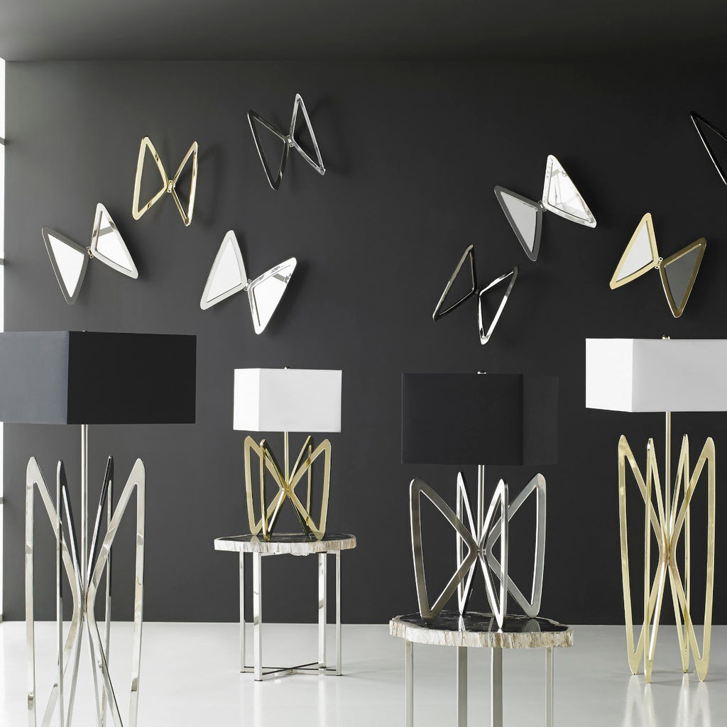 With ribs of stainless steel that meet in the middle to mimic the arc of its namesake's wings, the Butterfly Black Nickel Mirror is a modern decorative mirror that will bring panache to a room. The engineered steel piece has a surprising power, as it casts echoing shadows on the wall to bring it greater depth. We also offer this design, which is perfect for grouping in matching or contrasting finishes, in gold and silver; and in wall sculptures without mirrored glass.