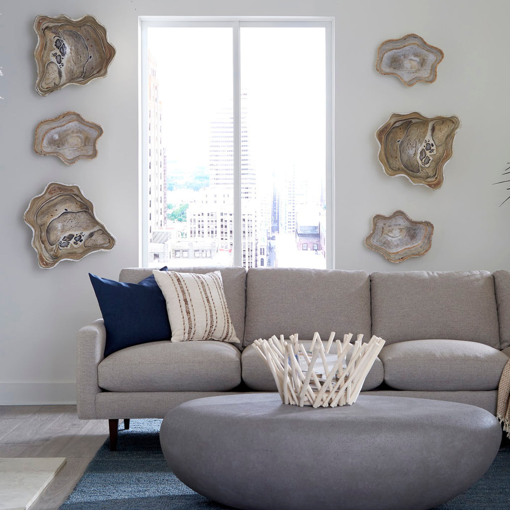 The Cast Onyx Large Faux Finish Wall Sculpture is a fluted decorative sculpture that looks as if it has been pulled from the earth after years of coming into its shape.