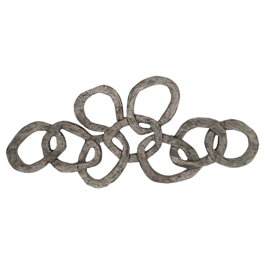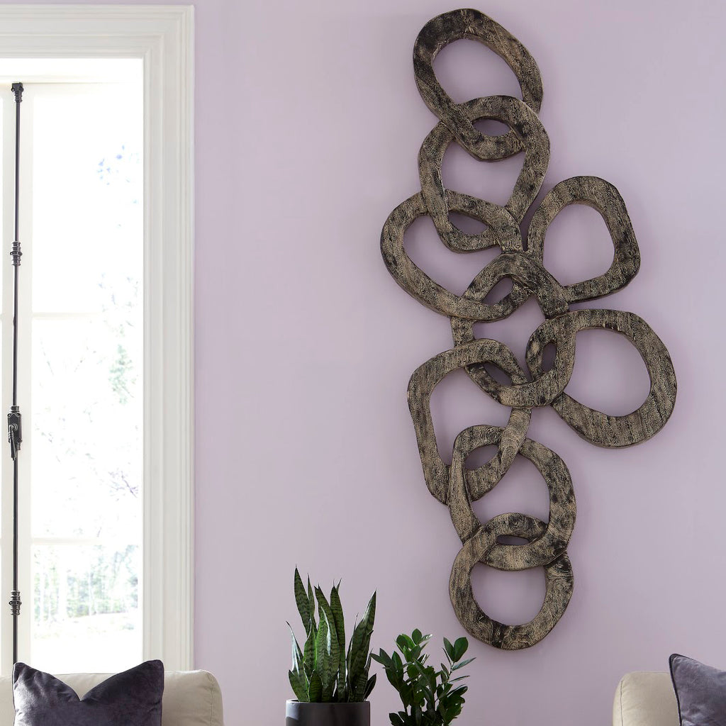 The Chain Gray Chamcha Wood Wall Art is a sculptural piece created from rings of golden acacia wood that are sanded and treated to a gray stone finish to create an organically shaped wall panel.