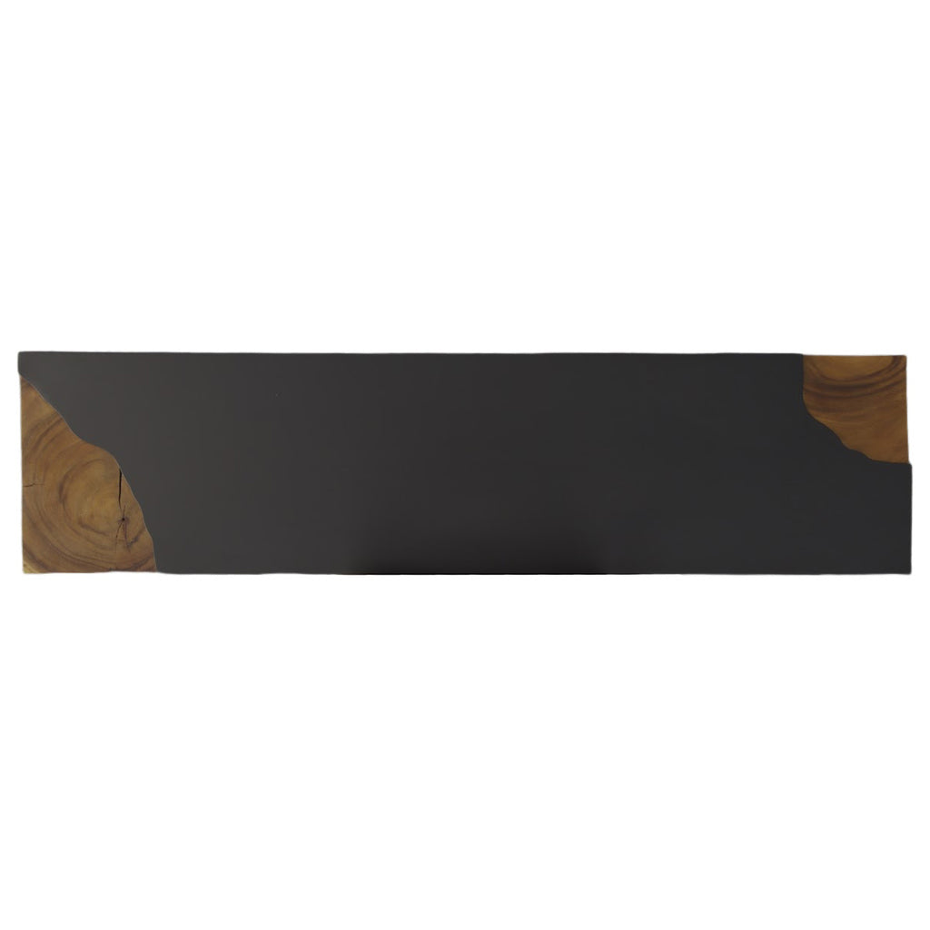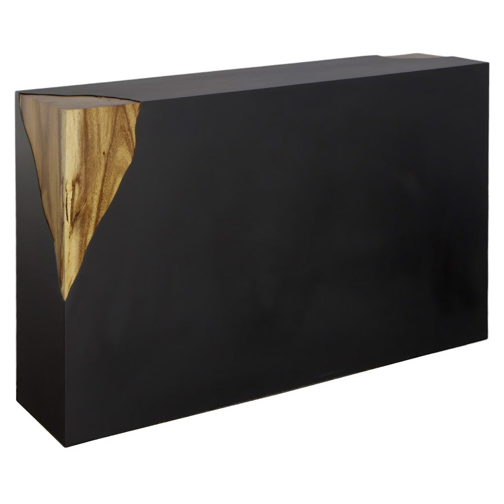 The Cornered Console Table is a sleek and sophisticated table made from black iron with a bit of natural chamcha wood peeking out from the corner. The mixed media design is both eye-catching and functional. This console table is primarily made from iron making it lightweight and easy to move. Natural chamcha wood accents provide the perfect contrast to the stark black iron.