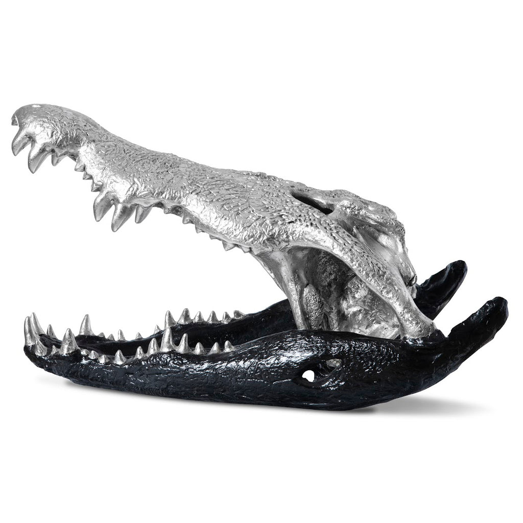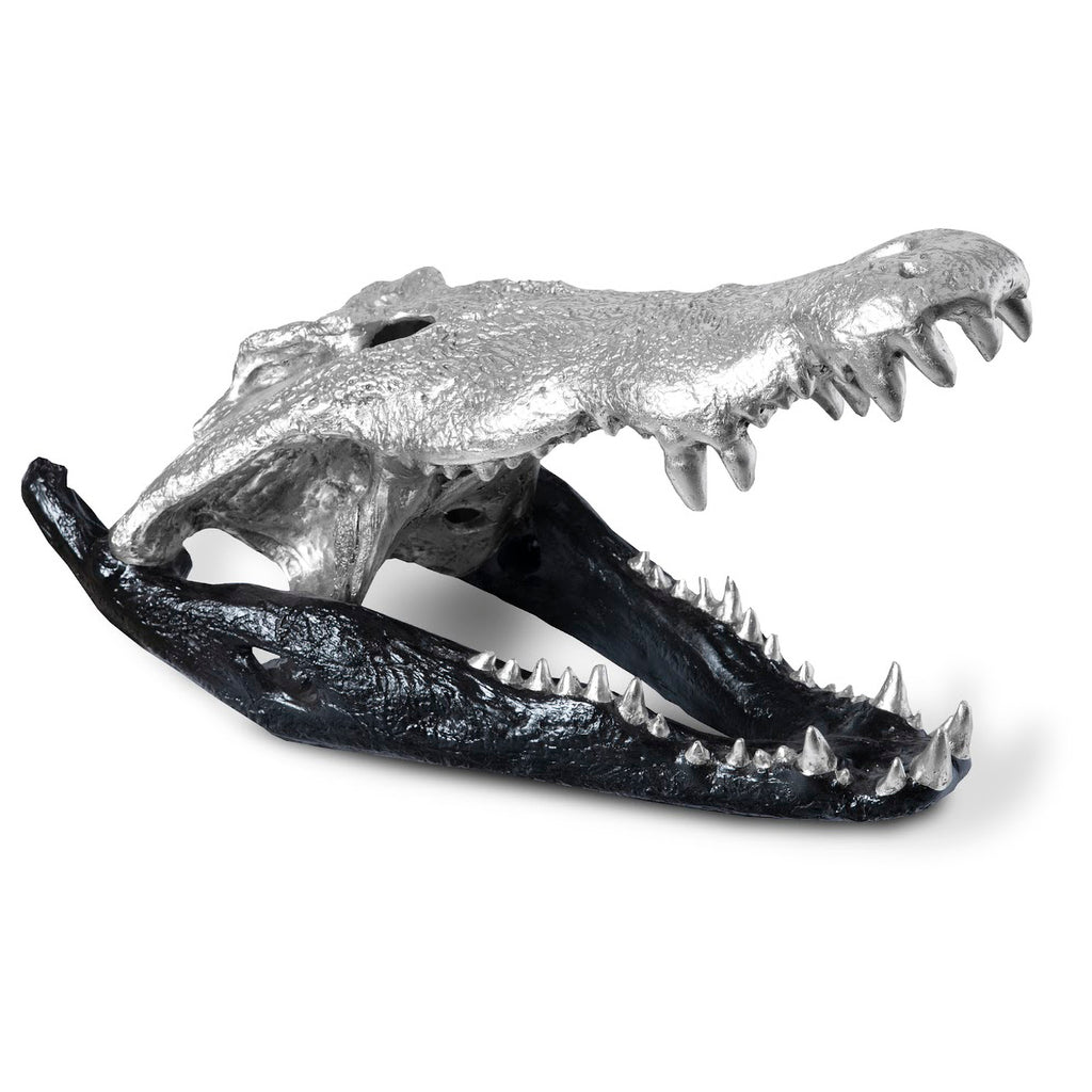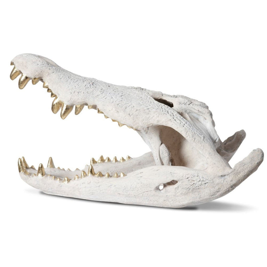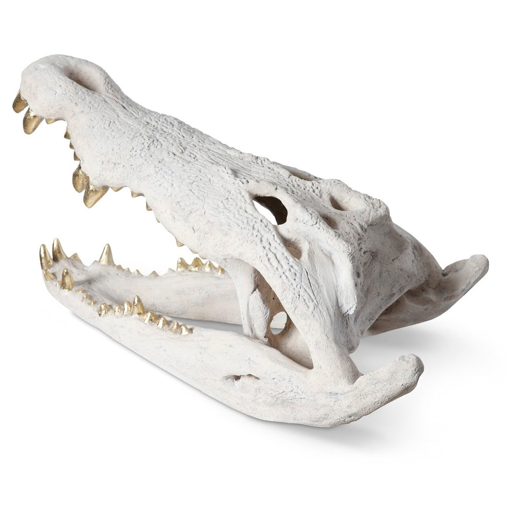 The Crocodile Skull Sculpture brings a room all of the exoticism the big game hunter has been afforded throughout history without having to spend time schlepping through the Everglades! Plus, there’s no guilt for the non-hunter with our toothy gold and black sculpture, as it is made of composite in gold and black finishes. A hint of glint to this jaw-dropping decorative accent by covering the crocodile’s teeth and snout in gold leaf.