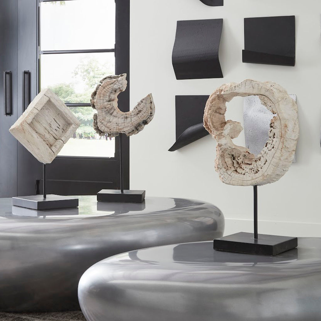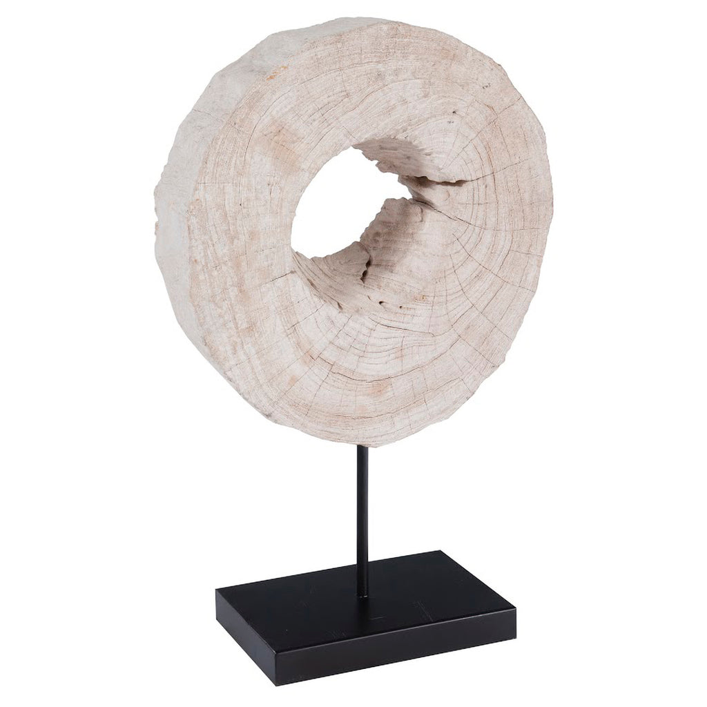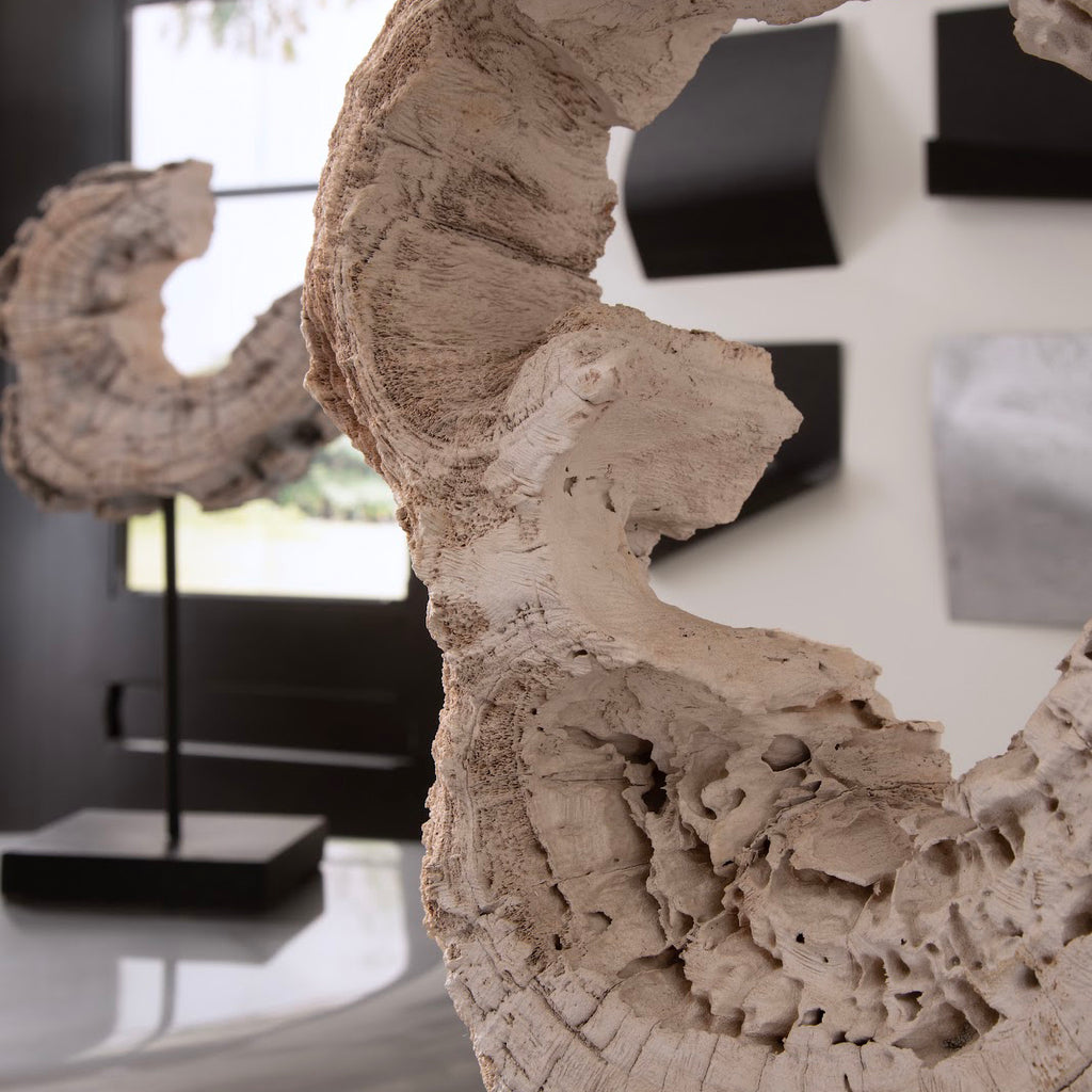 Erosion is a fascinating process in which wood and stone are broken down over time and relocated by the invisible hand of Mother Nature herself. When wood begins to erode, it can develop into unbelievably captivating shapes that defy imagination. Constructed from teak wood in a bleached finish, the Erosion Circle Sculpture is mounted to a matte black iron stand that gives this organic piece a splash of modern flair.