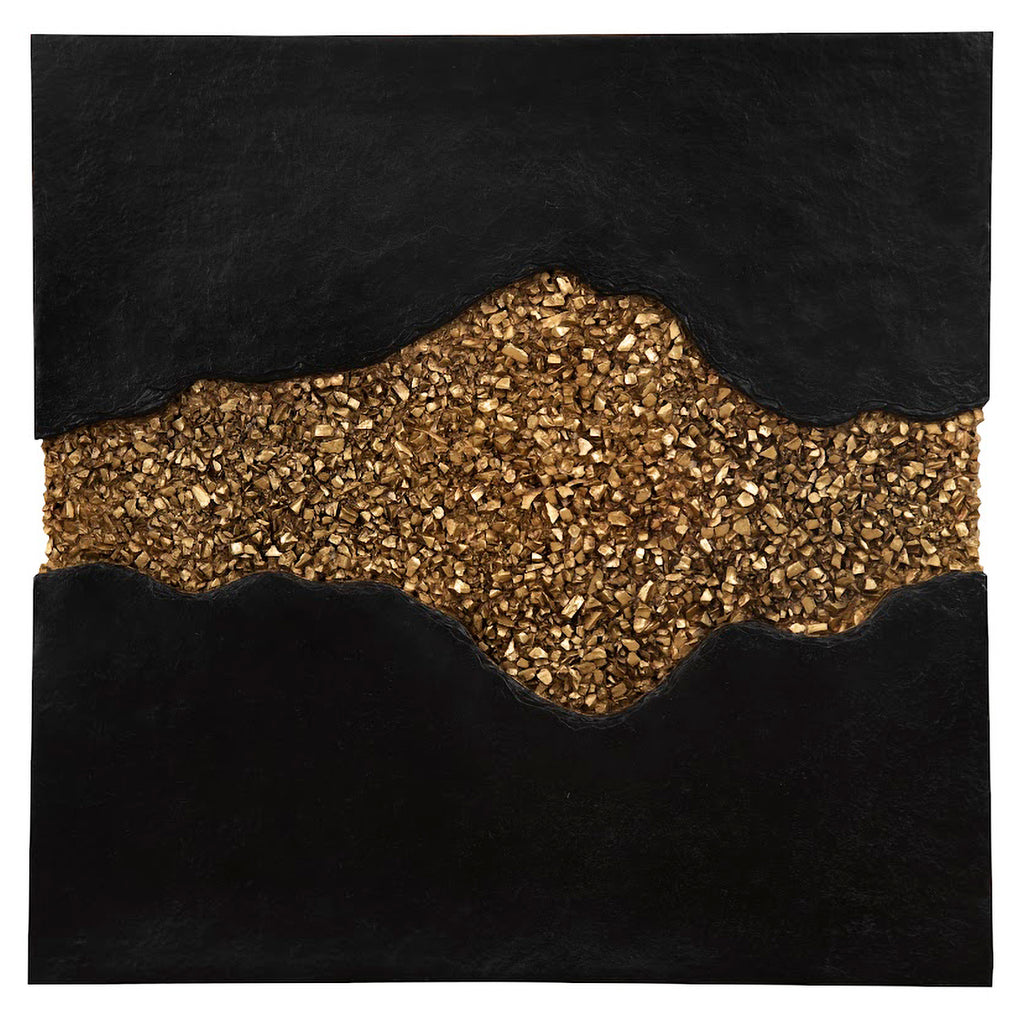The Geode Texture Wall Decor is a contradiction in several ways. Made of composite, the large statement piece has a textural gold river running along a smooth black background. Not only is there an interplay of rough and smooth juxtapositions on this black wall sculpture, the brightness of the gold and depth of the black prove that opposites attract.