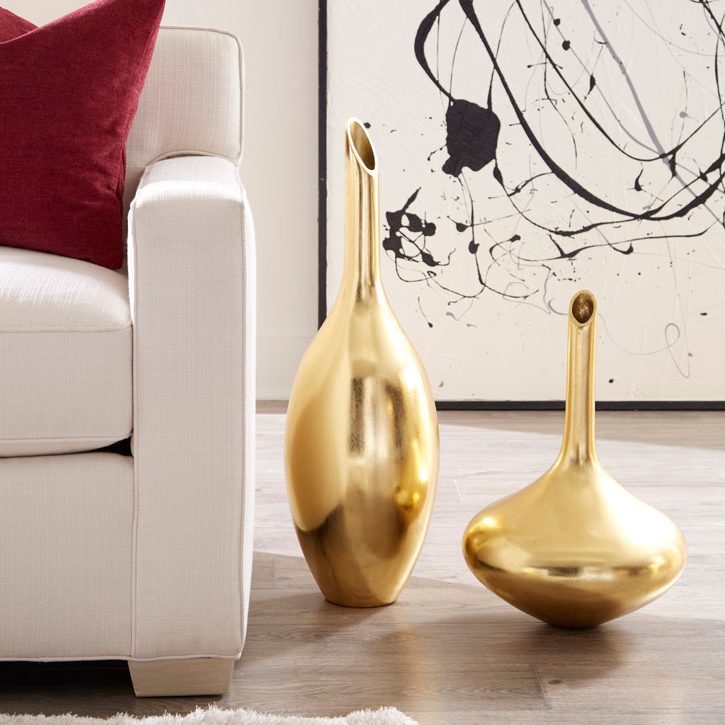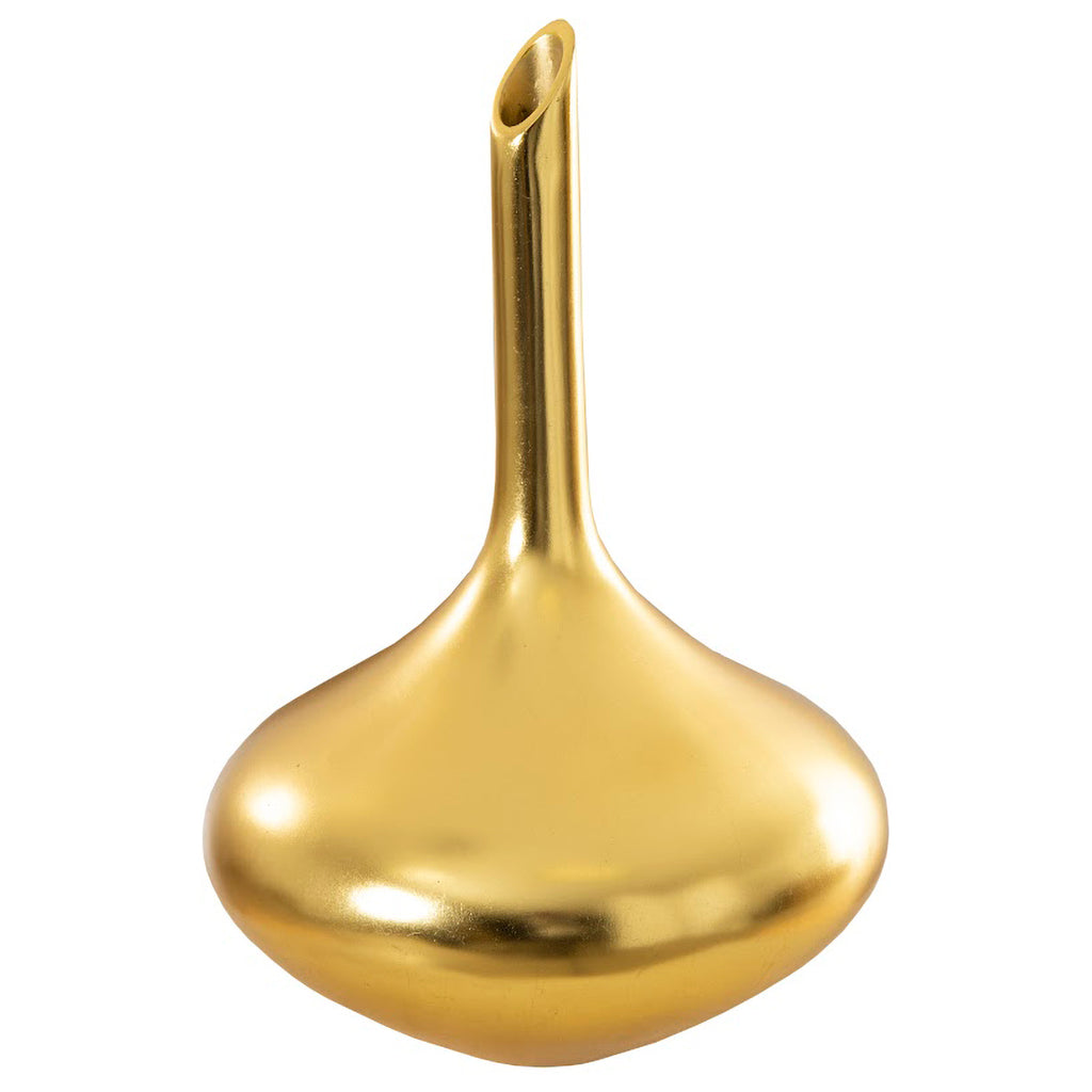 The Julian Vase is a vessel in a flared flask shape that is made of composite in a luminous copper, gold or silver finish. The decorative accessory will shine even when flowers are absent thanks to its brilliant surface..