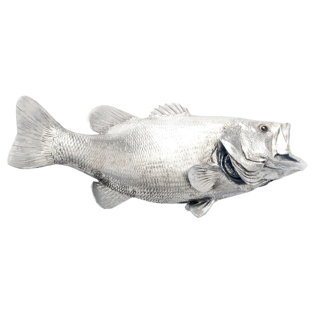 The Large-Mouth Bass Wall Sculpture is made of composite in a silver leaf finish. This likeness of the lake creature is a chameleon of style—hang it in a modern kitchen and it takes on a zesty panache; place it in a child’s bedroom and it will become a playful element in the space. Whether you have a lakefront home, a beachfront condo, or an urban oasis, the Large-Mouth Bass Wall Sculpture with its luminous finish will bring the watery world inside. Powerful on its own, group this sculpture in multiples to create a school of fish for added impact.