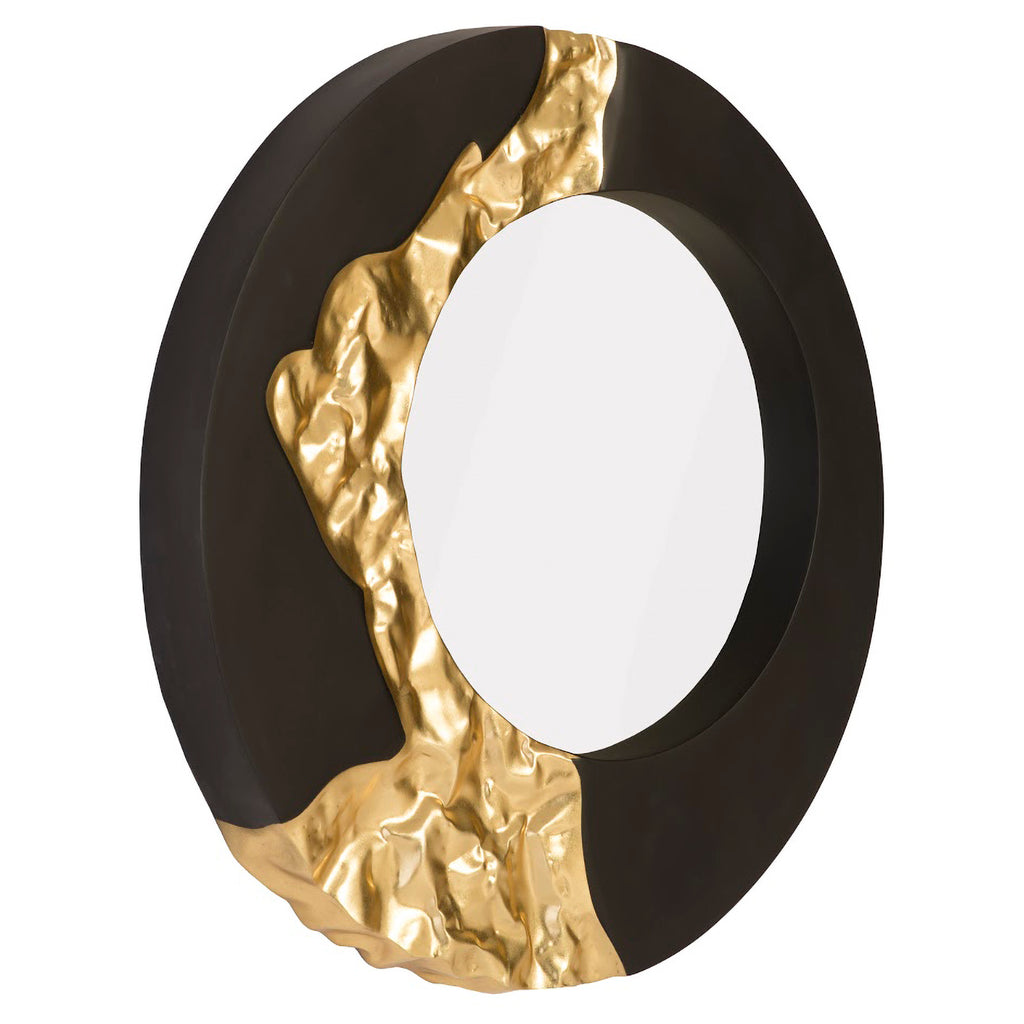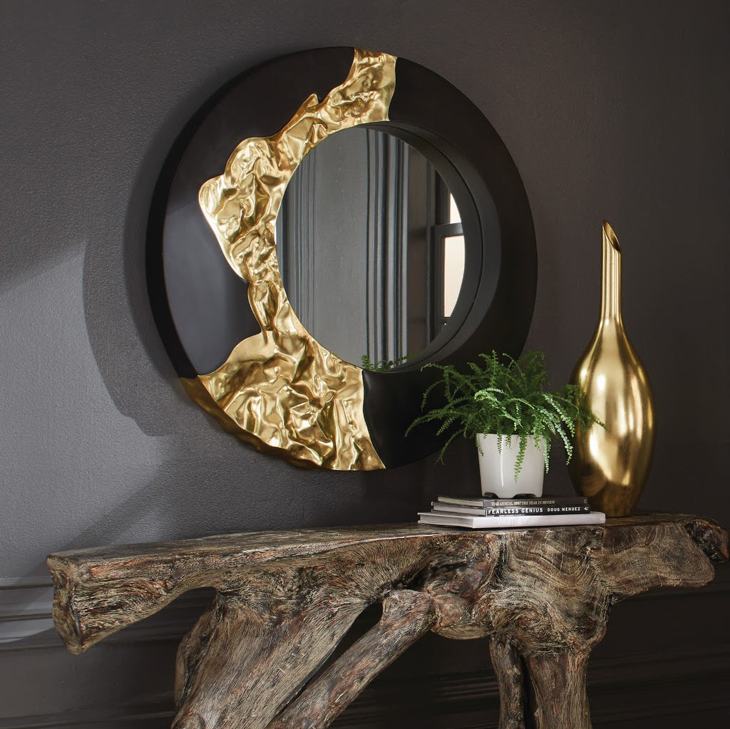 The otherworldly pattern that flows along the frame of the Mercury Round Black Gold Mirror makes a statement in its randomness, mimicking the surface of some far-away planet but with much greater style. Made of composite in a intermingling of black and gold leaf finishes, a design detail of note is how the decorative mirror’s frame is fluted where the gold pattern flows along it. This round mirror reflects the ethos that Phillips Collection personifies: modern organic. We also offer this design in a square version and in round in silver.