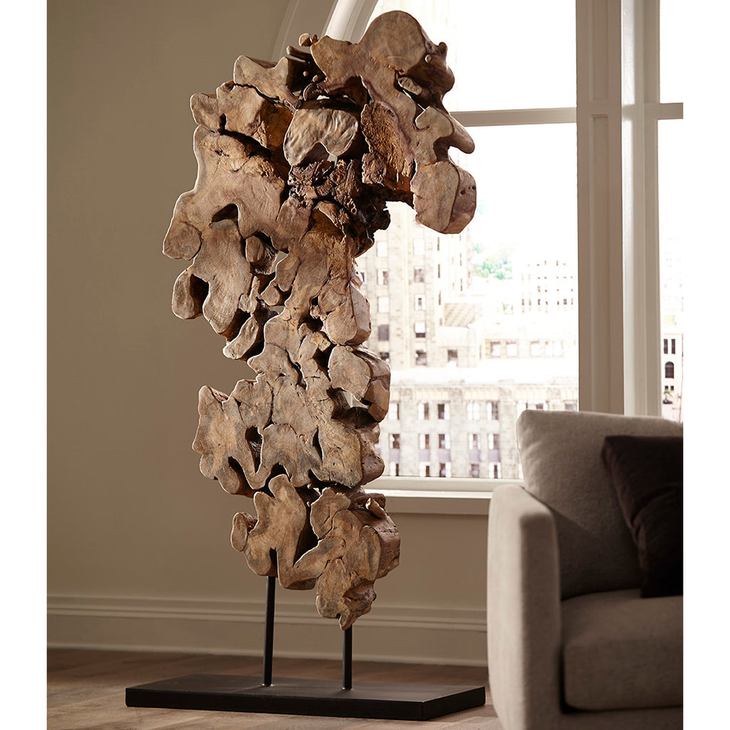 The perfect example of how we use even the most random pieces of natural wood we source, the Pipal Wood Sculpture is made from pieces of wood that many product designers would see as useless castaways. The warmth of the wood and the clean lines of the minimal metal as are juxtapositions. A design detail of note is how the pieces of wood are loosely joined to create a continuous piece of art.