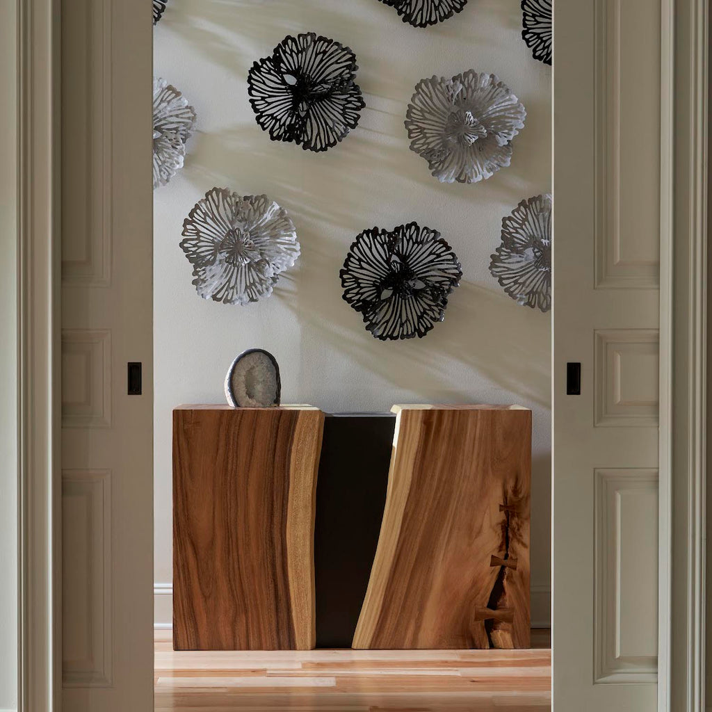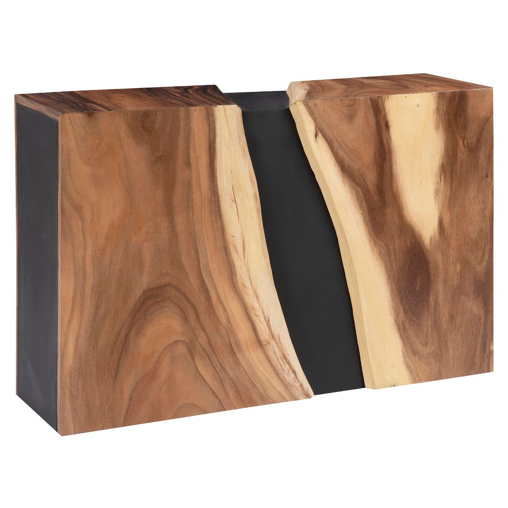 Cladding a sleek black upright rectangle in the flowing patterns of Golden Acacia wood was the brilliant move we made with the River Console Table. The sleek black base contrasts the lovely warmth of the natural wood to make a statement wherever it is placed. Because it is double-sided, it can go against the wall but it doesn’t have to be placed with one side hidden, which makes this a flexible piece in a room.