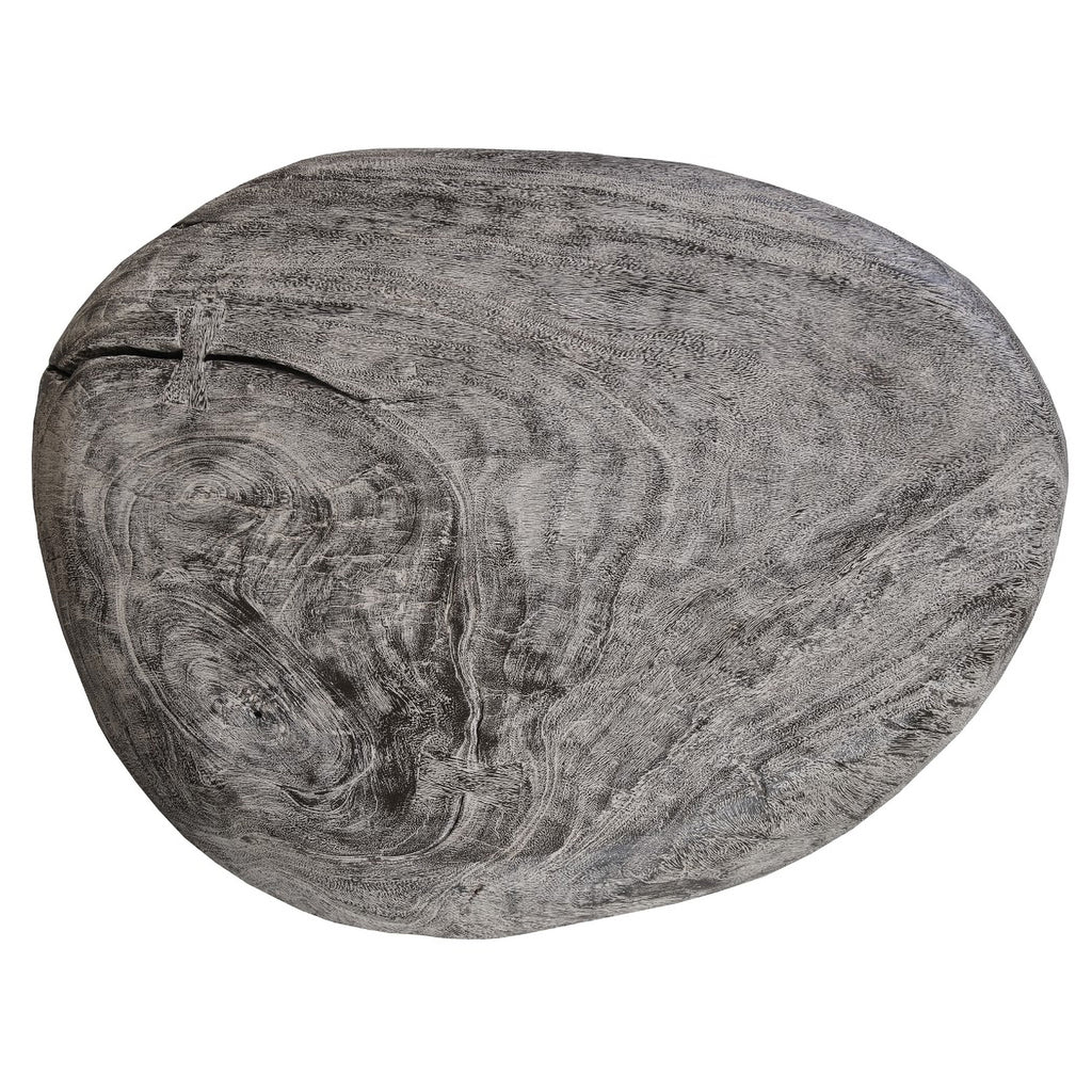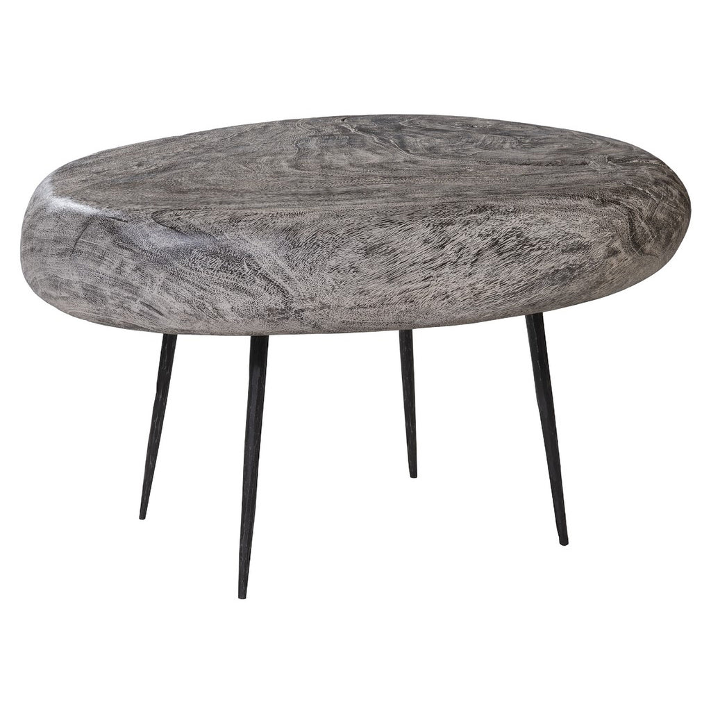 The Skipping Stone Large Natural Side Table is a traditional design that inspires nostalgia for the great era we now call Americana with a twist. It is made of wood in a natural finish. Round tables have rested next to sofas and chairs in American living rooms and dens since our country's great woodworkers began plying their trade. We simply chose a reclaimed piece of wood in an organic shape to increase the table's appeal. A design detail of note is the thinness of the forged metal legs, which contemporizes the design a bit.