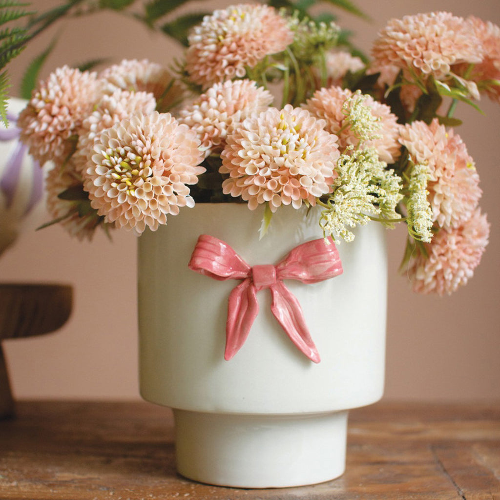 This ceramic flower pot with pink bow detail is perfect for a little girl's room or a gift to a new mom. Plop in a potted plant or watch your seeds grow together. It fits anywhere you need a touch of pink.
