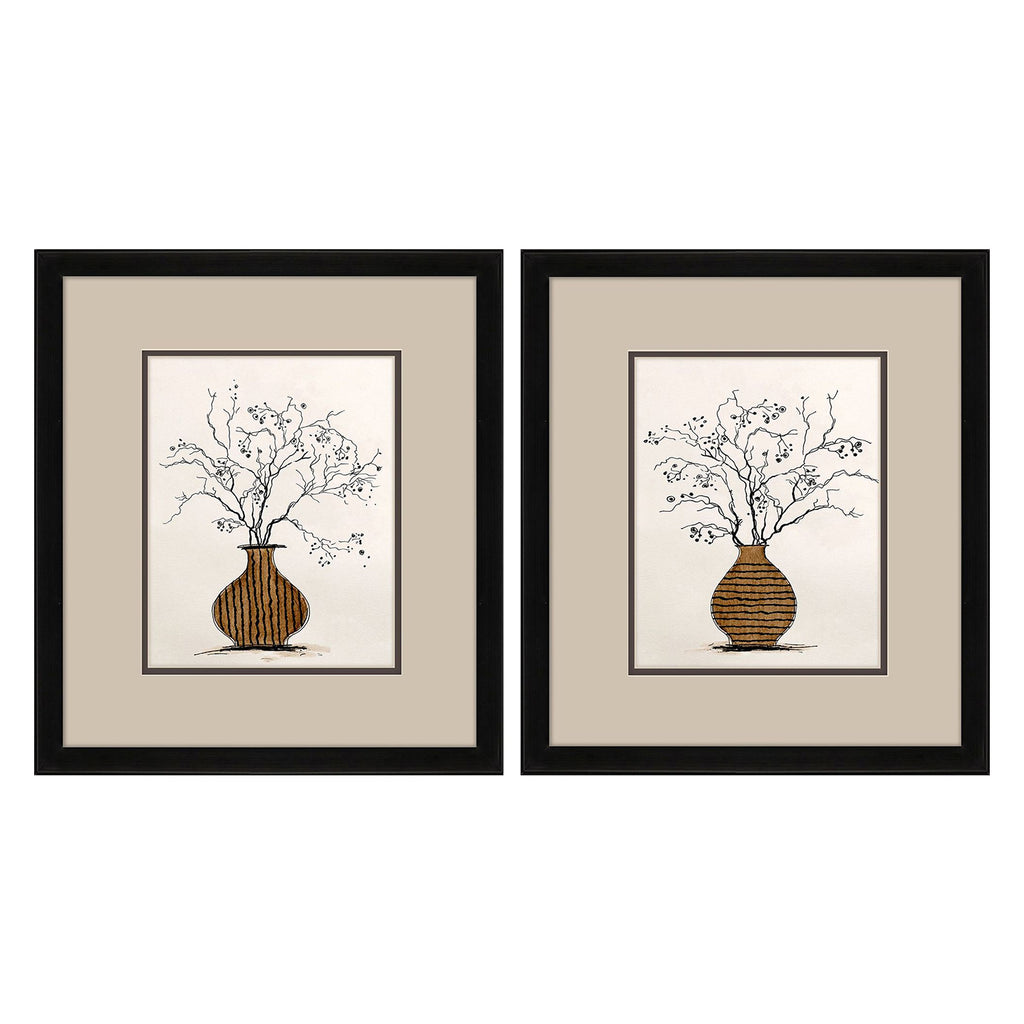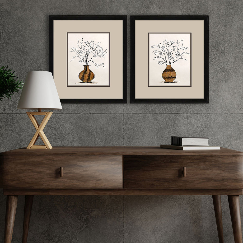 A contemporary still-life set highlights black floral arrangements in mod vases. Matted in pewter and framed in a modern flat black moulding.