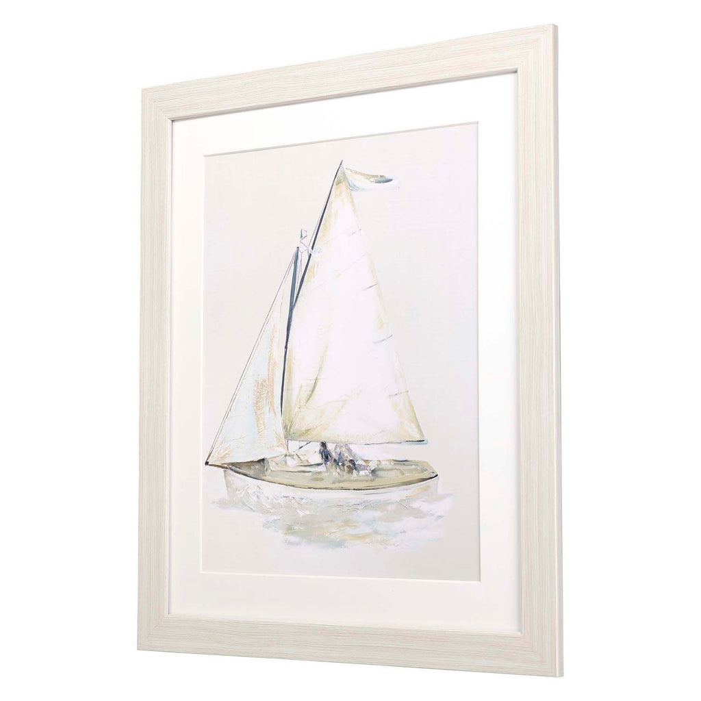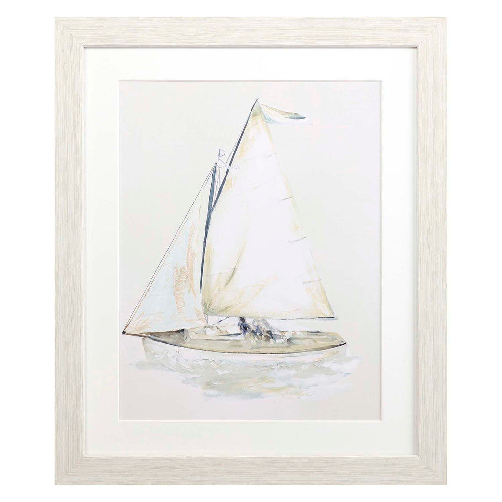 Sailboat is matted in ultra thick museum core white. Framed in a whitewash flat profile molding.