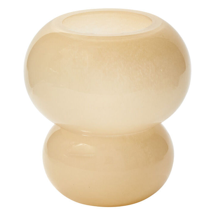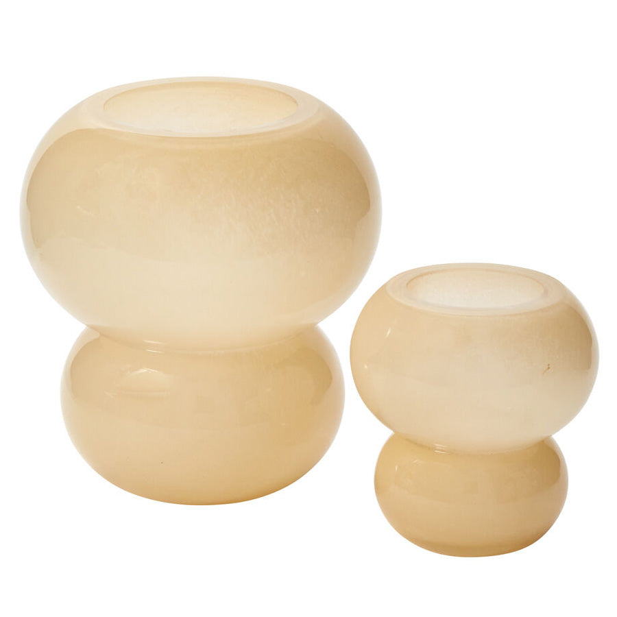 Add a bit of modern whimsy to your displays with the handmade glass Pollinator Vase, featuring 2 unique stacked spheres for a trendy bubble look. An opening size fits a few statement stems. With its neutral, soft yellow color & modern shape, this colorful flower vase is a florist staple & an on-trend wedding & event vessel that can transition easily for everyday use, particularly as a stand-alone decorative piece.