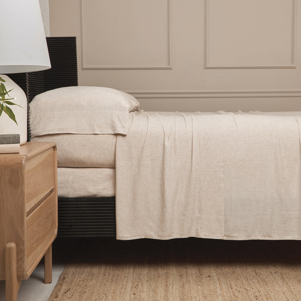 Effortlessly soft with a naturally relaxed feel, this bamboo linen sheet set blends the light, breathable comfort of bamboo with the textured beauty of linen. The warm natural color—a grounding, versatile neutral—complements any space with ease. Cool to the touch, moisture-wicking, and incredibly soft, these sheets get better with every wash. Perfect for those who value comfort, simplicity, and timeless design. Set includes a fitted sheet, flat sheet, and a pair of pillowcases. Twin set includes 1 pillowcase.