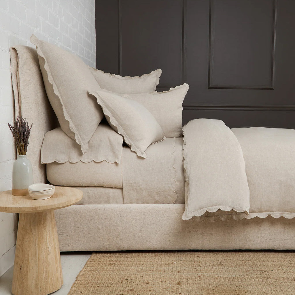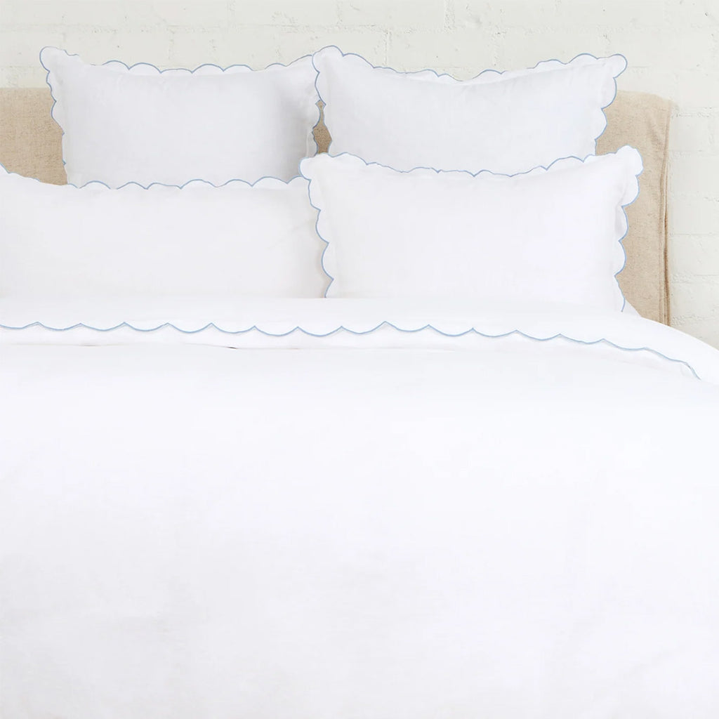 The essence of romantic simplicity. The Pom Pom at Home Kelly collection embellishes our classic linens with delicately embroidered scalloping in a range of soft hues. In the same fabrication as our signature extra-soft linen sheeting, Kelly’s thread embroidery gives each edge dimension along with a hint of color.Kelly’s European flax linen duvet covers and shams are complete with mother-of-pearl closures and inner corner duvet ties, inviting you to lounge in a bed of airy luxury. Scalloped on all four sides, your duvet can be styled with a turndown – no unadorned edges in sight.