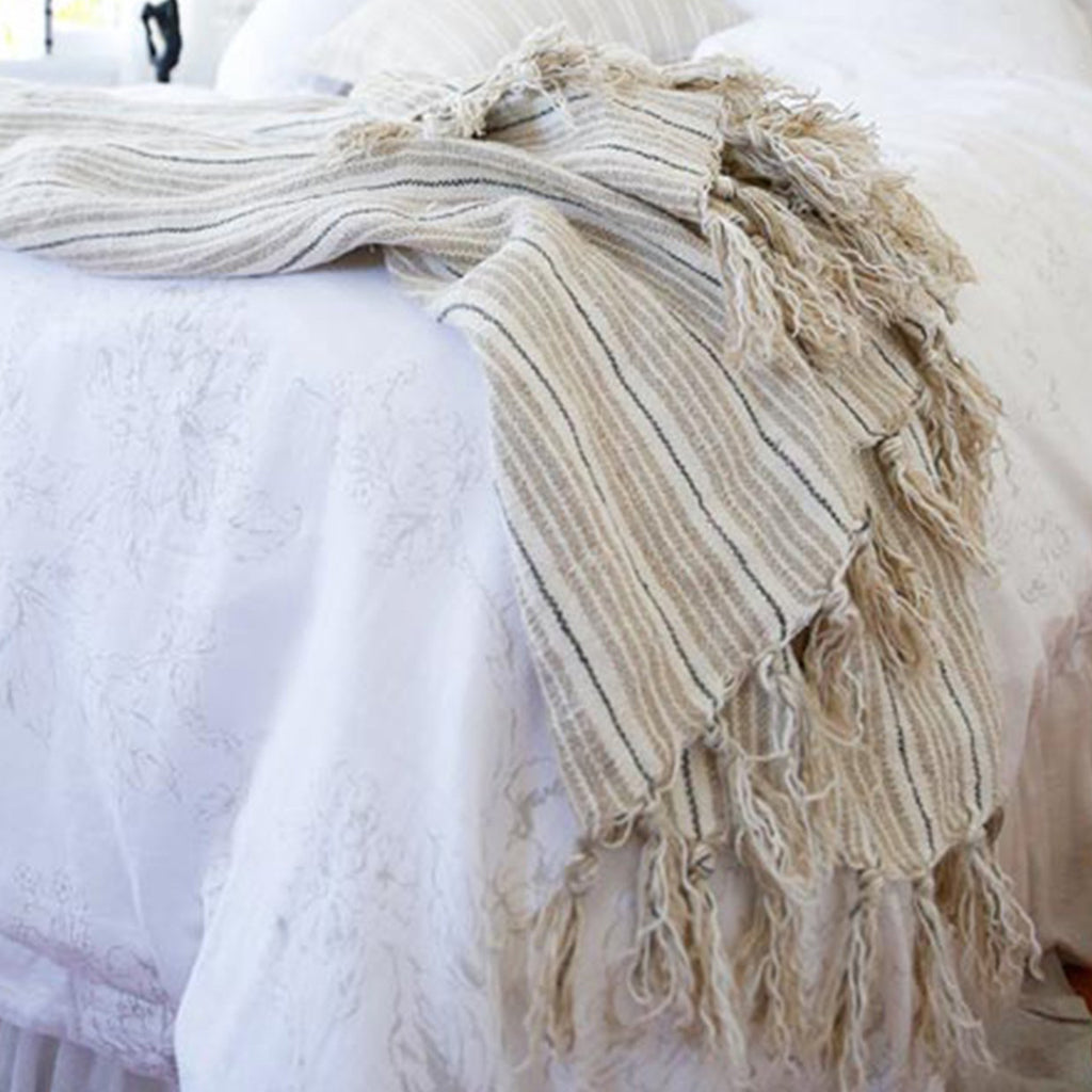 The soft, heavy knit linen is hand-loomed and features a thicker natural stripe alongside a thin midnight stripe with tassels all along the edge.