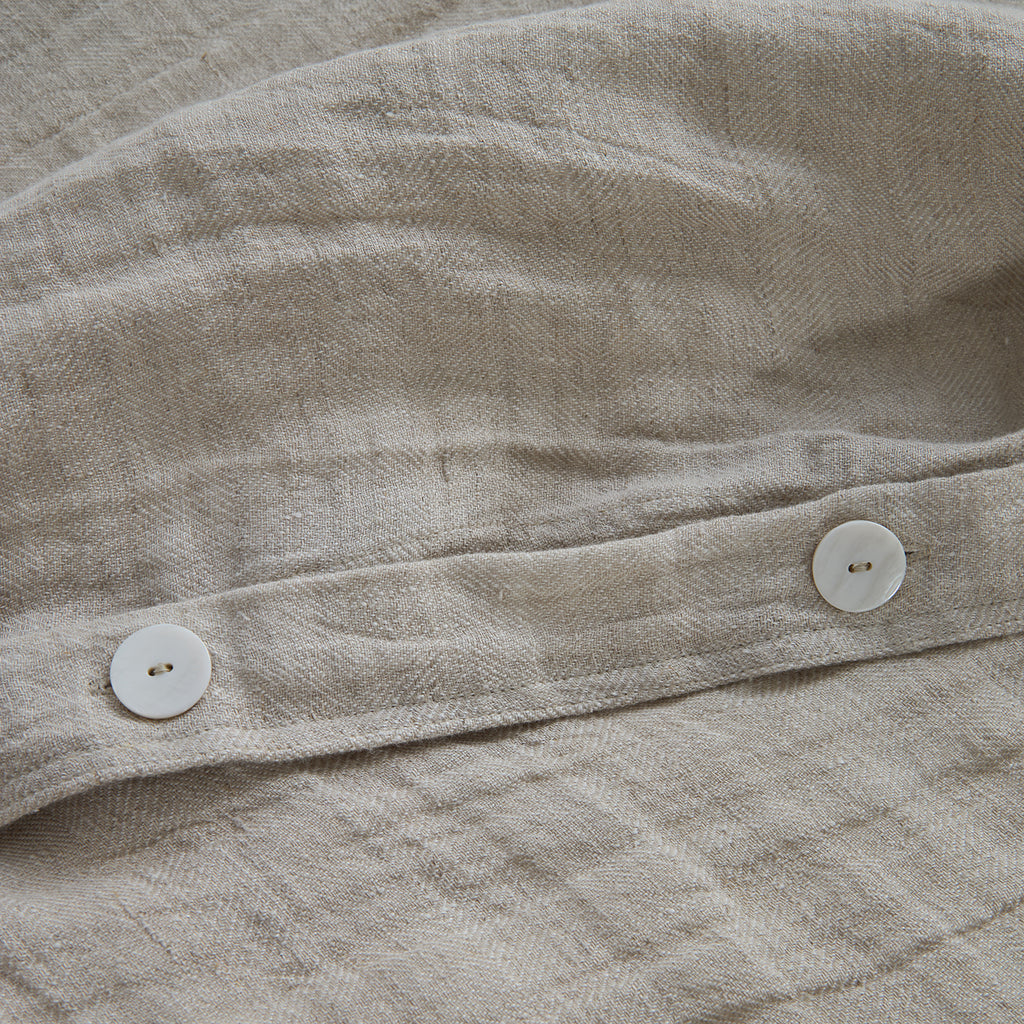 Shaped by the quiet luxury of nature and everyday ease, the Rory in Flax/Midnight is crafted from 100% linen and woven with a subtle herringbone pattern for soft texture and depth. Thoughtfully designed with shell button closures and inner corner ties, this duvet keeps your insert secure while adding a polished finish. The breathable linen softens beautifully with every wash, making it a go-to layer for year-round comfort. Pair it with other pieces in the Rory collection to create a bed that feels calm, collected, and quietly luxurious.