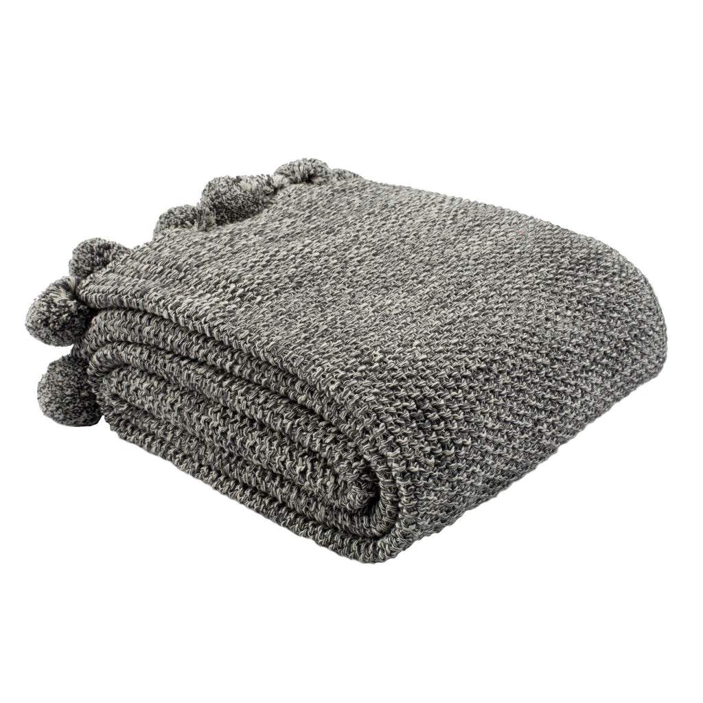 The Pom Pom Knit Throw Blanket is fringed with decorative pom-poms for a playful twist on classic accent blanket design. Soft cotton yarns are knitted in a warm, high-touch texture with a blend of cool grey and light natural hues making this accent throw a comforting addition to any living room sofa, loveseat or master suite.