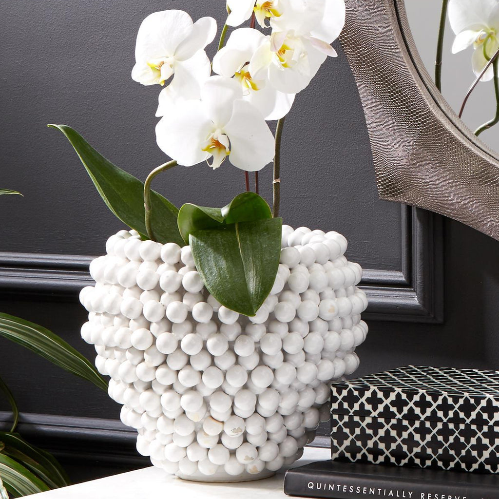 Sculpted by hand with hundreds of small porcelain globes, this vase and decorative accessory is as chic as it gets. Created totally by hand in a skilled ceramic studio this container is sculpted globe by globe in porcelain creating a true work of art. Each piece will be unique and makes the perfect heirloom and container for plants or flowers and much more.