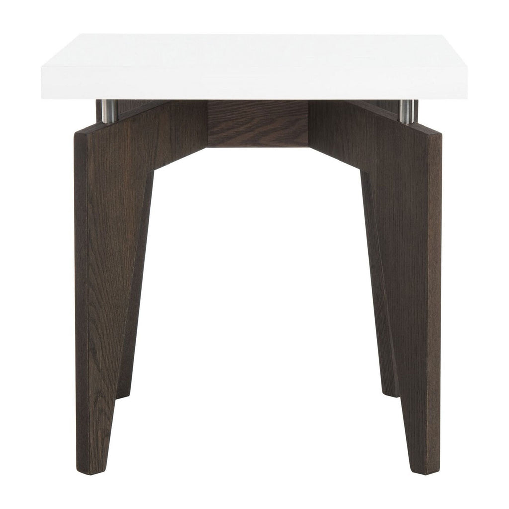 The smooth white lacquer top of this contemporary end table appears to float on metal posts that connect it to dark brown or grey wood grained legs. Graphic and sleek, the surface of this end table is easy to clean and great for entertaining.