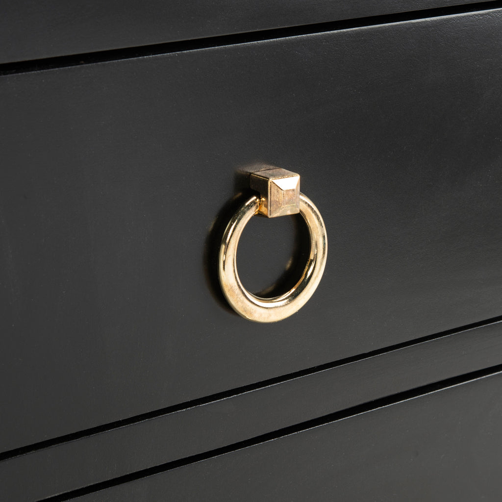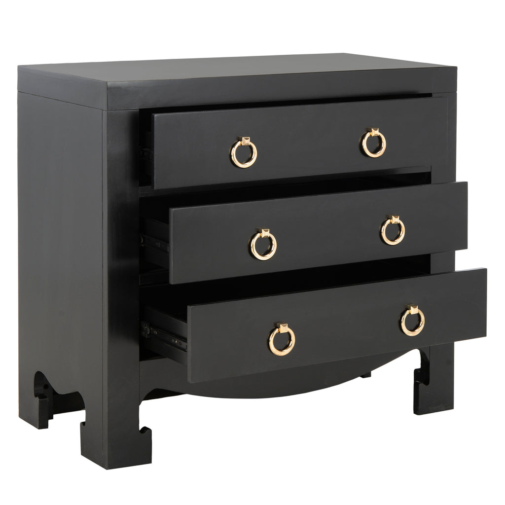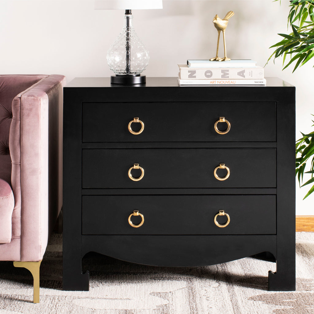 The minimalist Asian-style curves of this contemporary 3-drawer chest instantly updates any living room. Crafted with pine, its smooth white finish is complemented by sophisticated gold ring pulls. Ample drawers ensure that clutter remains safely stored.