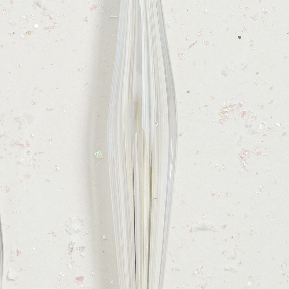Add an icy touch to the tree with the Prism Icicle Ornament, an elongated clear glass style with vertical ribbing and an iridescent finish. The Prism comes in two sizes and create a layered look when styled together and with other icicle ornaments in the collection. A metallic silver string makes these easy to hang all over a festive tree.