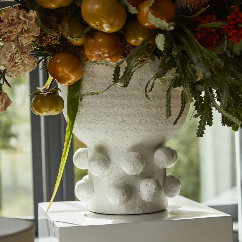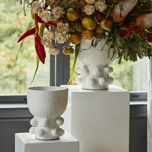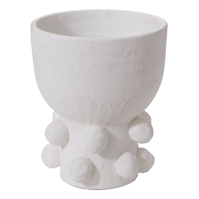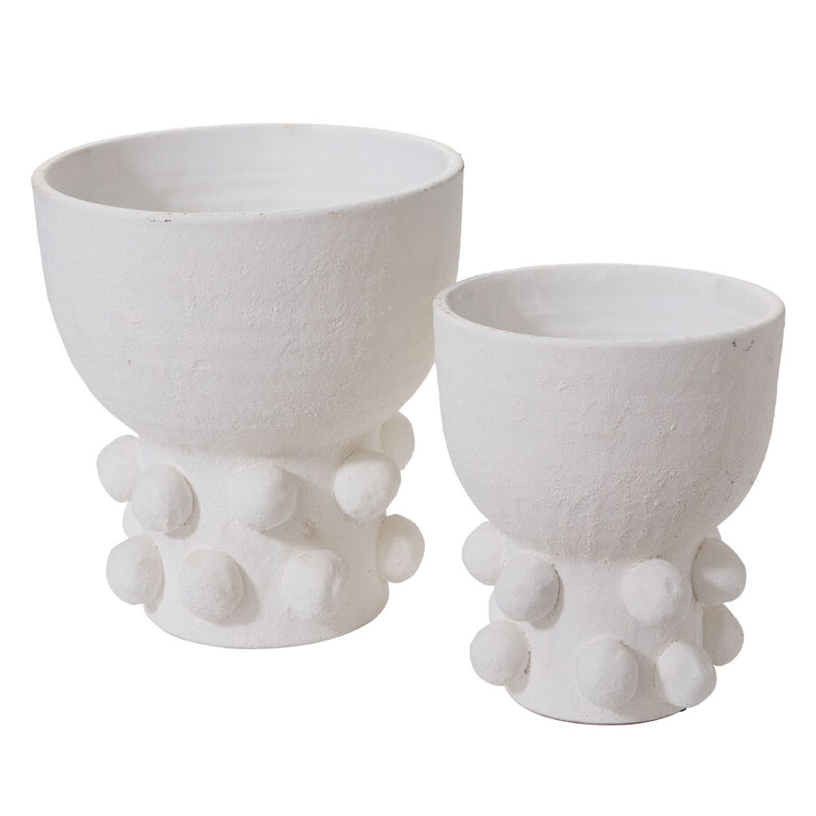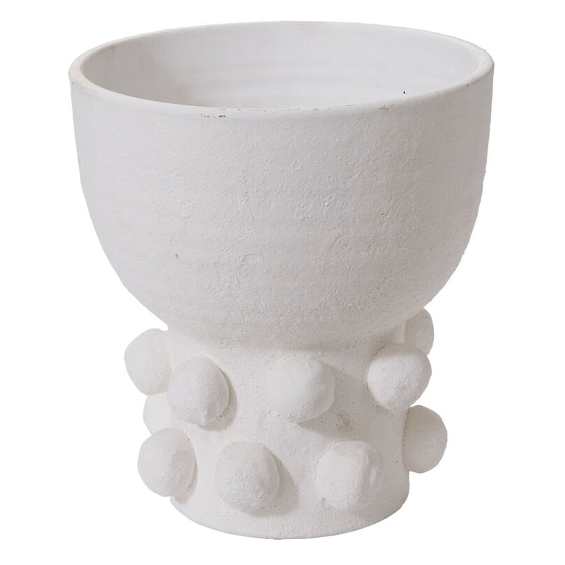 Though clean & neutral in color, the terracotta Proton Footed Pot is anything but subtle with its sculptural design, footed design, & dimensional spheres around the base. With a painted matte white finish, this watertight pot makes an artful decorative accent or centerpiece for a 10-inch drop-in plant. This trendy vessel is perfect for home & gift retail or modern plant shops.