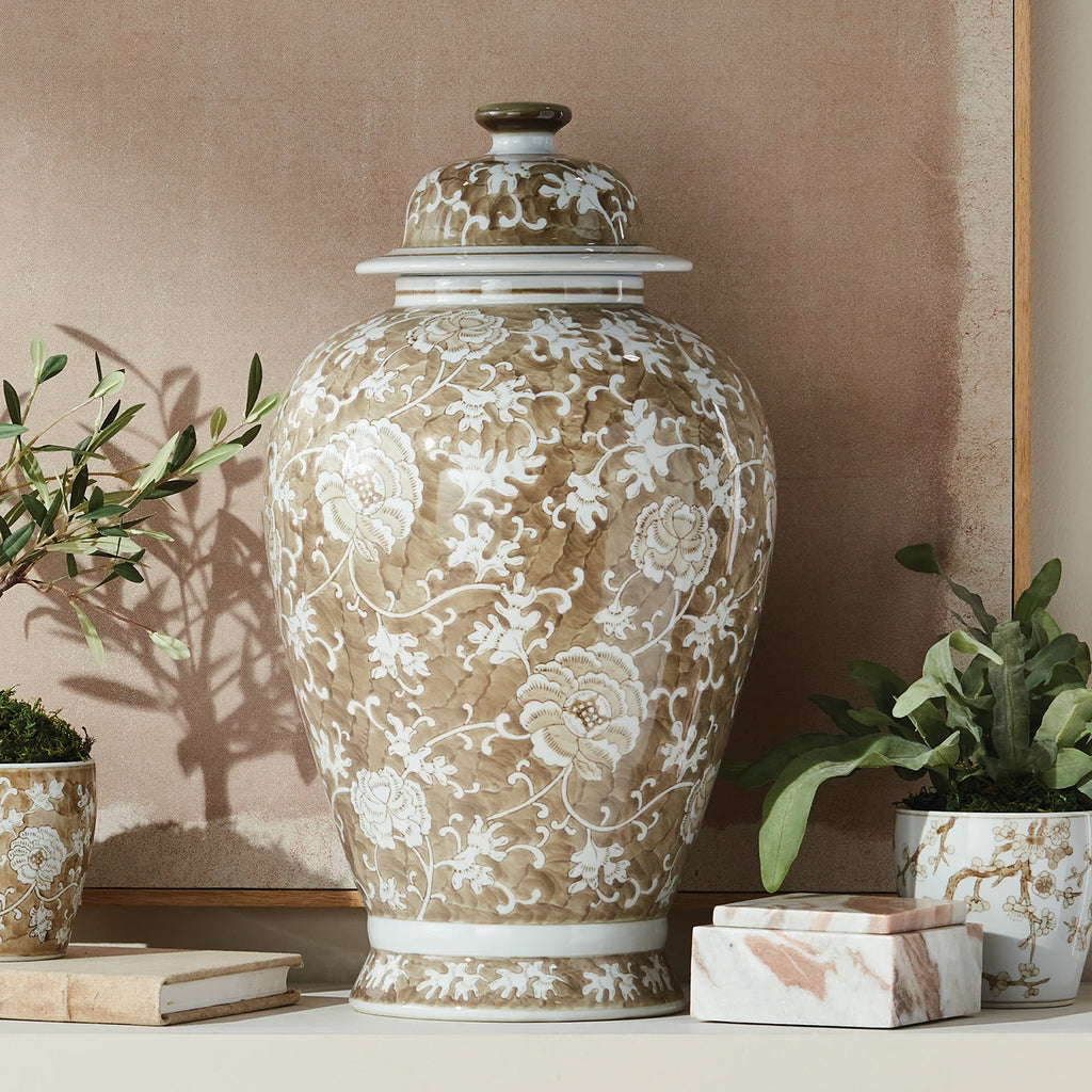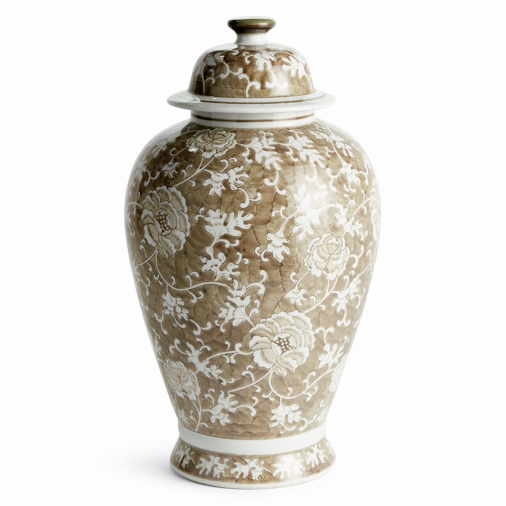 A classic chinoiserie look in taupe and white. In design, taupe is often associated with muted, sophisticated qualities. It evokes balance and timelessness. A tone that plays well in any palette, and is an inspired design choice for this lidded ginger jar. A welcome addition to the well-appointed bookshelf, mantel or entry console.